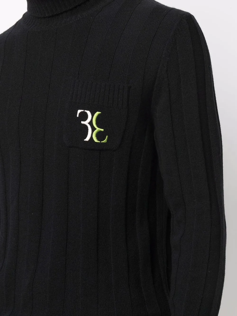 Трикотаж в рубчик, вышитый логотип на груди, высокий воротник, длинные рукава и прямой подол. Цвет: черный.