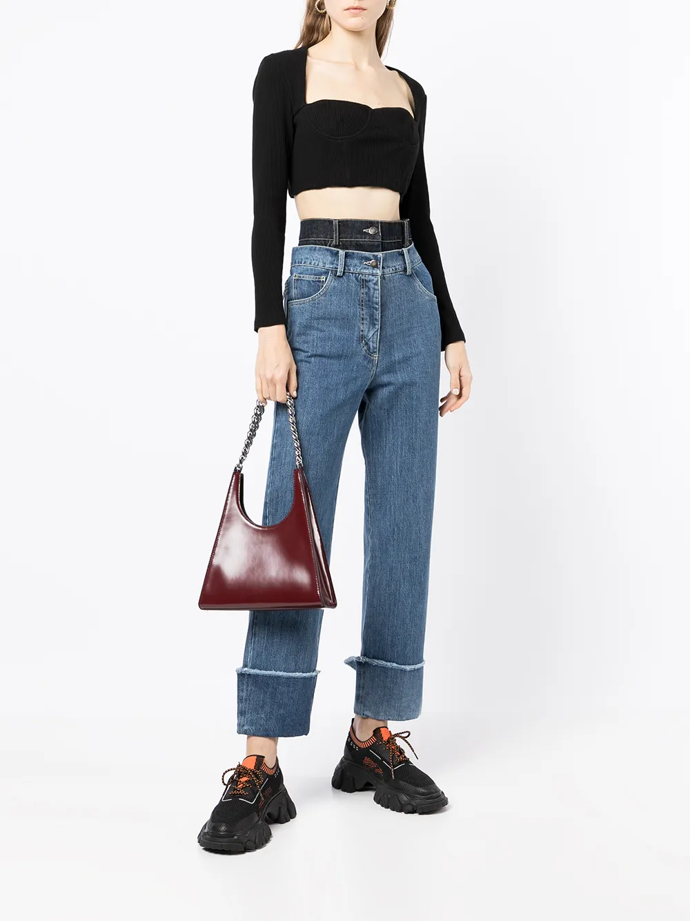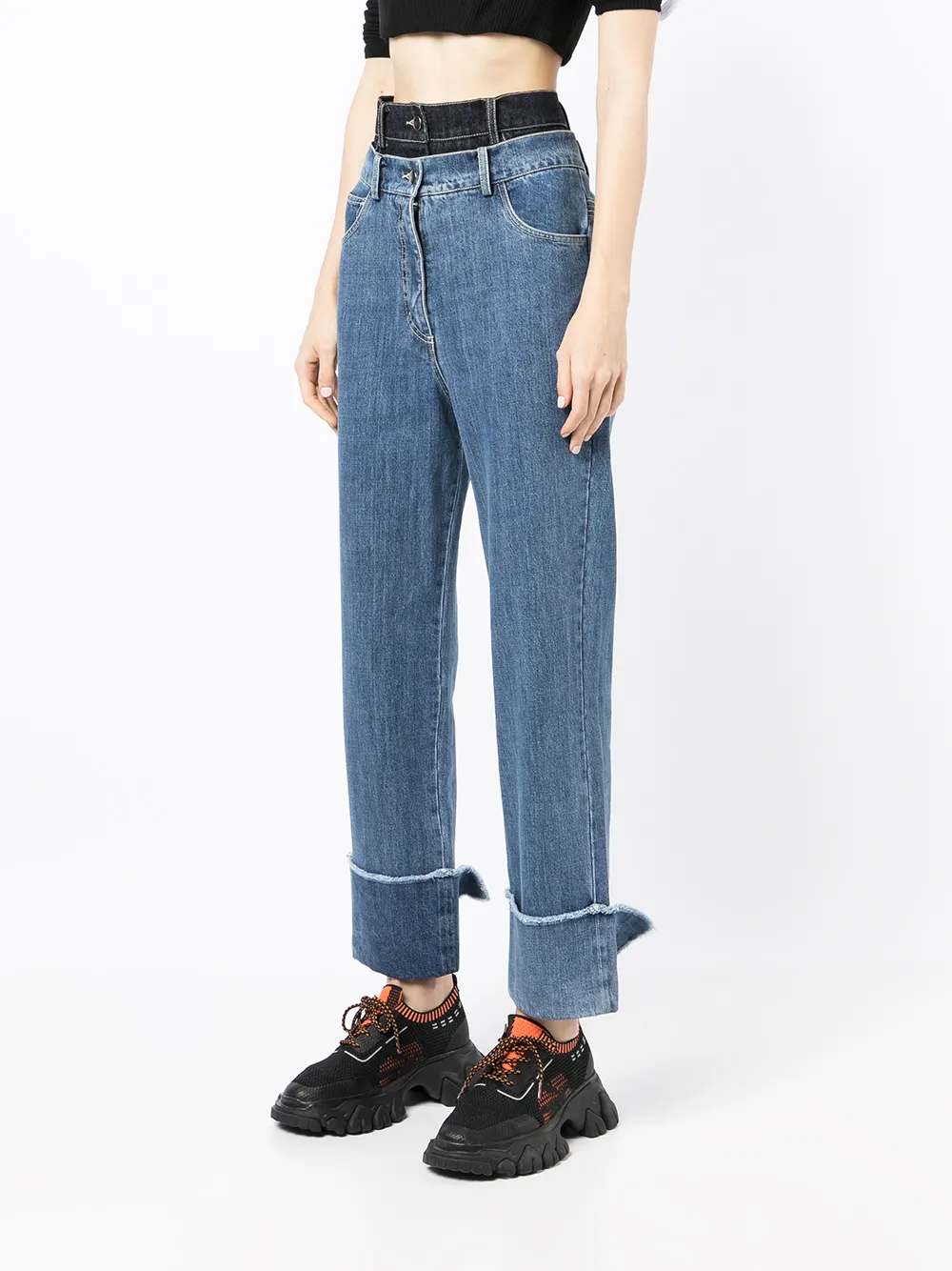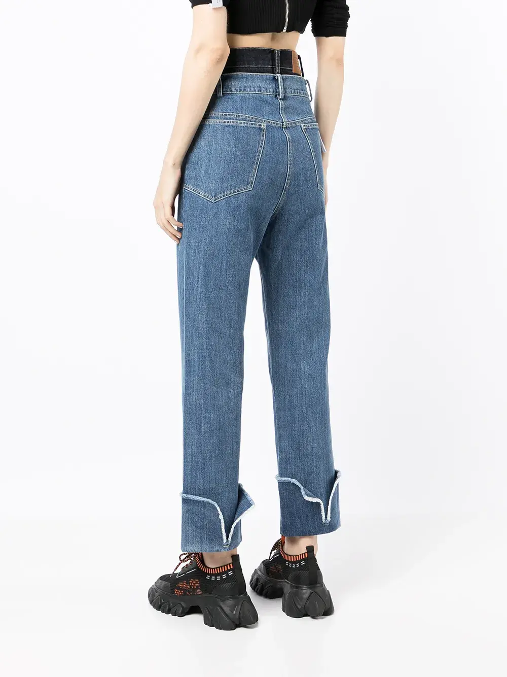 Многослойный дизайн, необработанные края, нашивка с логотипом сзади, завышенная линия талии, застежка на молнии и пуговице спереди, петли для ремня, классическая пятикарманная модель, подвернутые манжеты и укороченная длина.