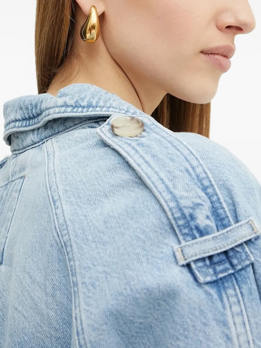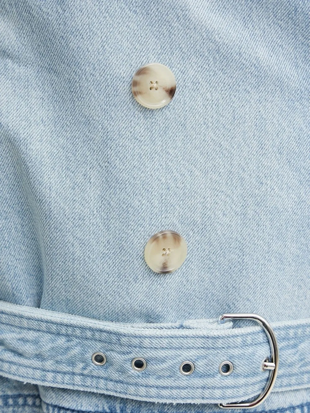 Светло-голубой двубортный пиджак с застежкой на талии, поясом, роговыми пуговицами, спущенными плечами, свободным кроем.