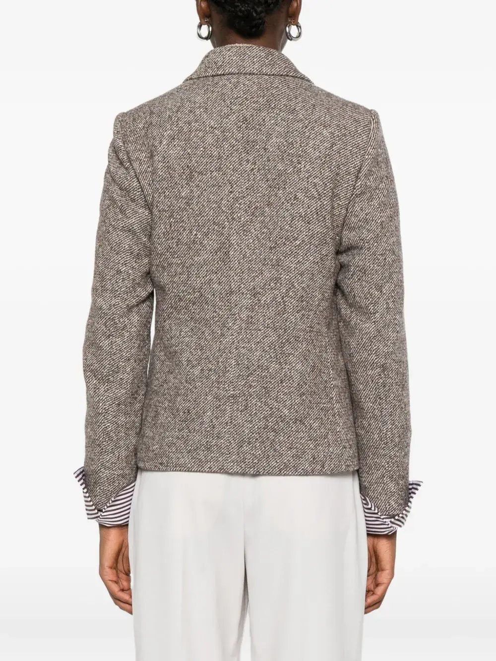 Коричневый двубортный пиджак с заостренными лацканами и длинными рукавами.