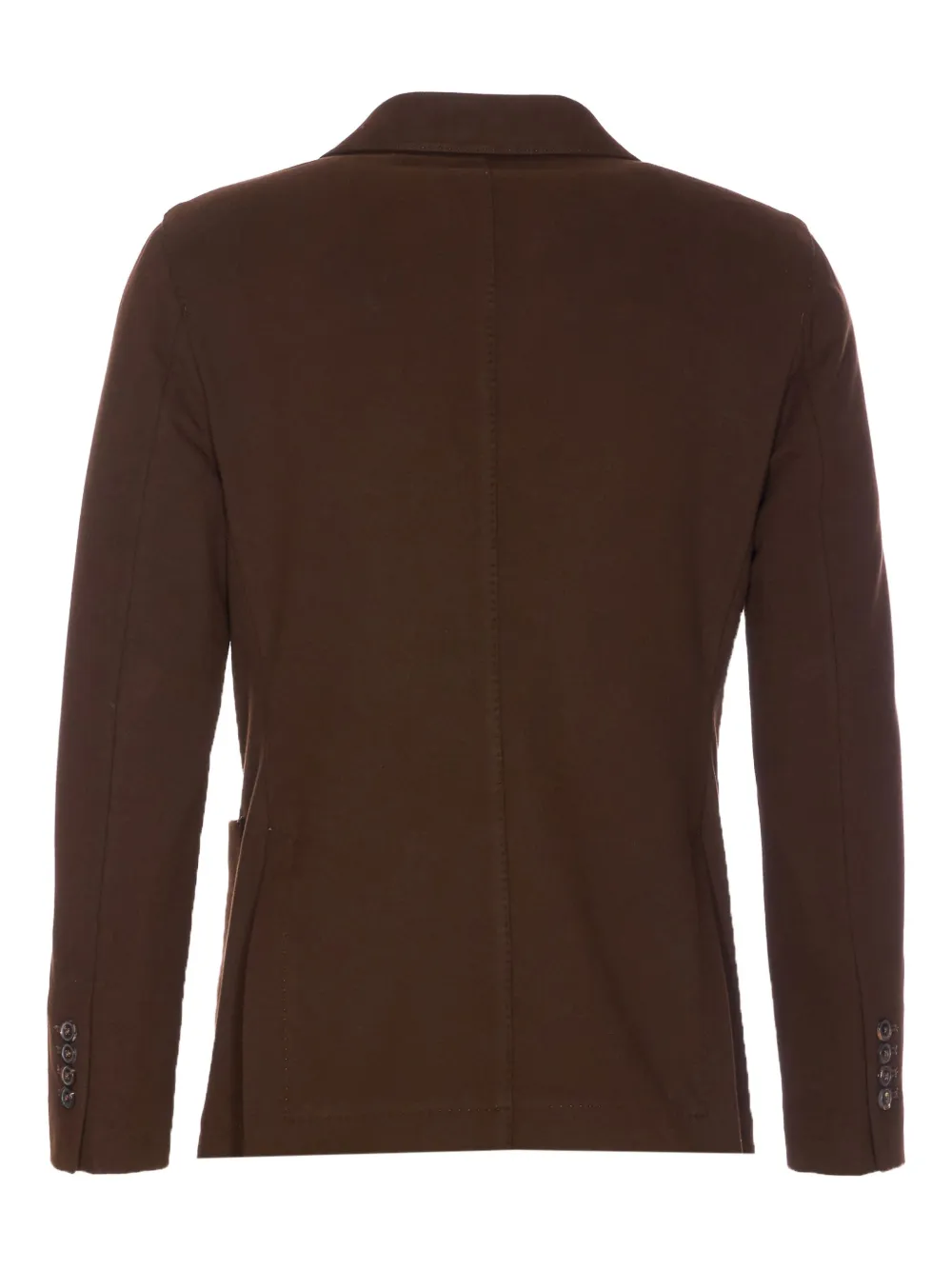 Коричневый двубортный жакет с застежкой на длинные рукава, пуговицами на манжетах, V-образным вырезом и передними карманами.