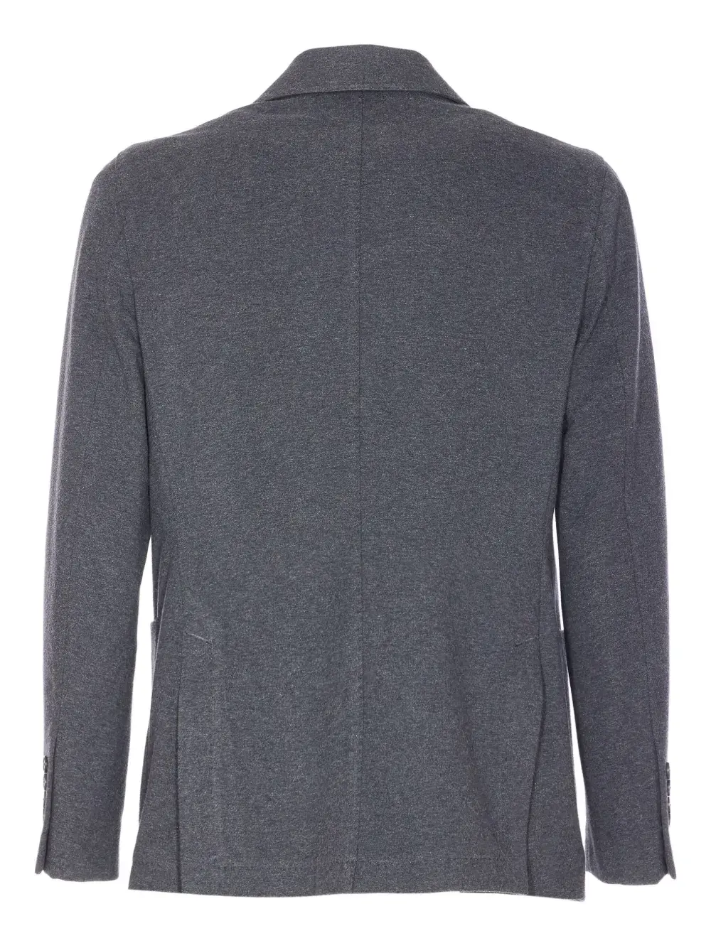 Серый двубортный пиджак с застежкой на длинные рукава, манжеты на пуговицах, передние карманы.