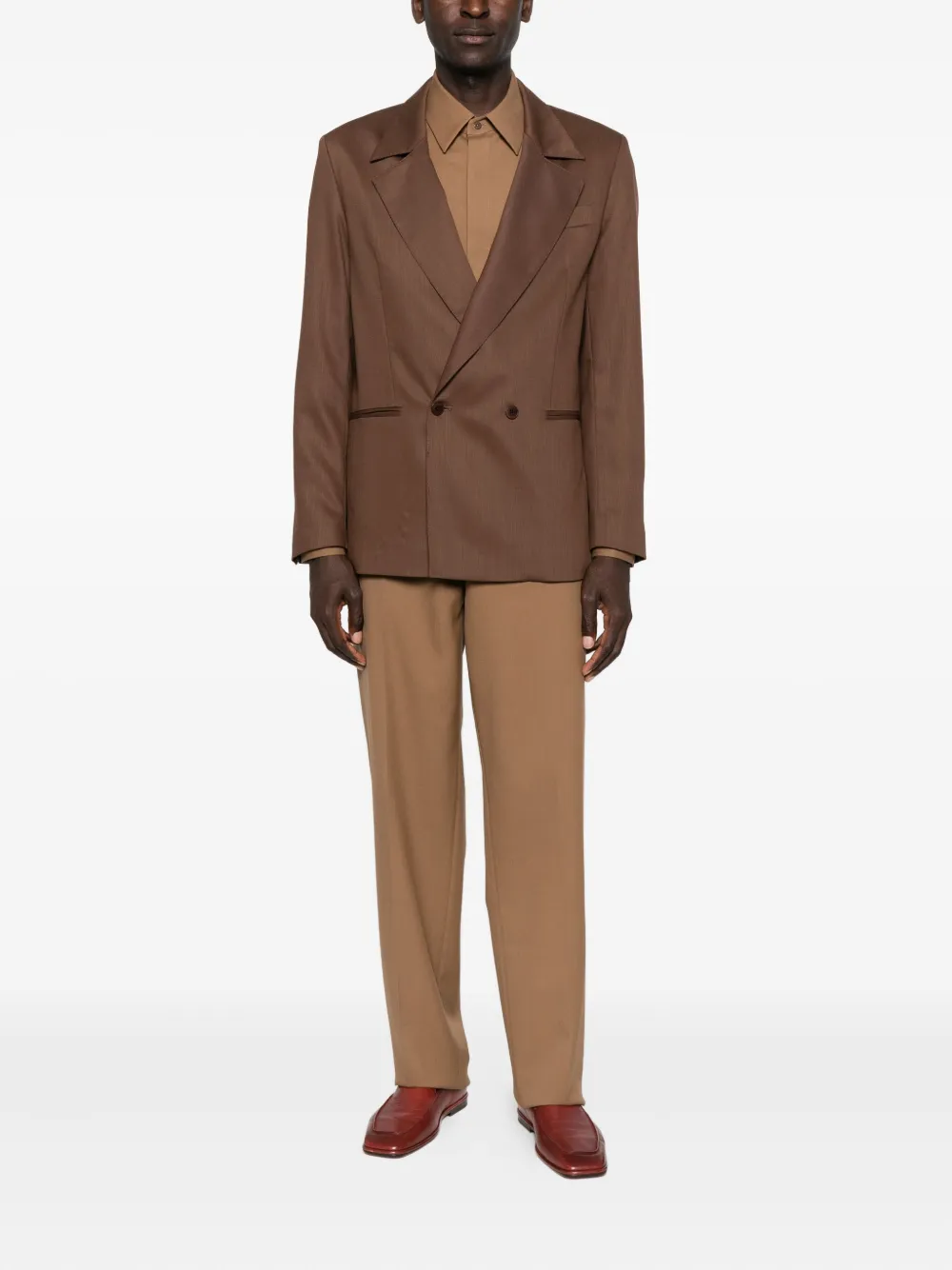 Коричневый двубортный пиджак с заостренными лацканами, длинными рукавами и прорезными карманами.