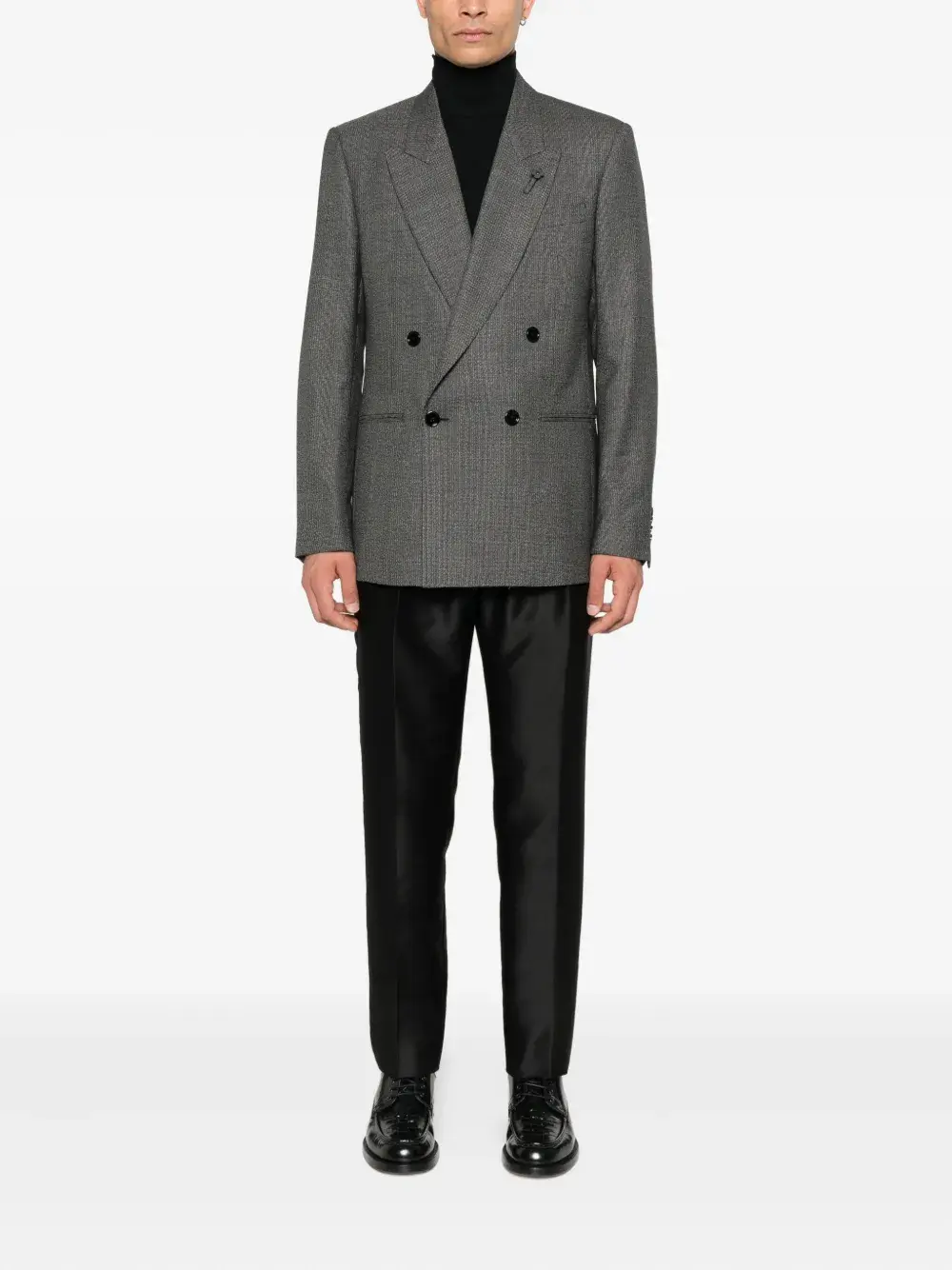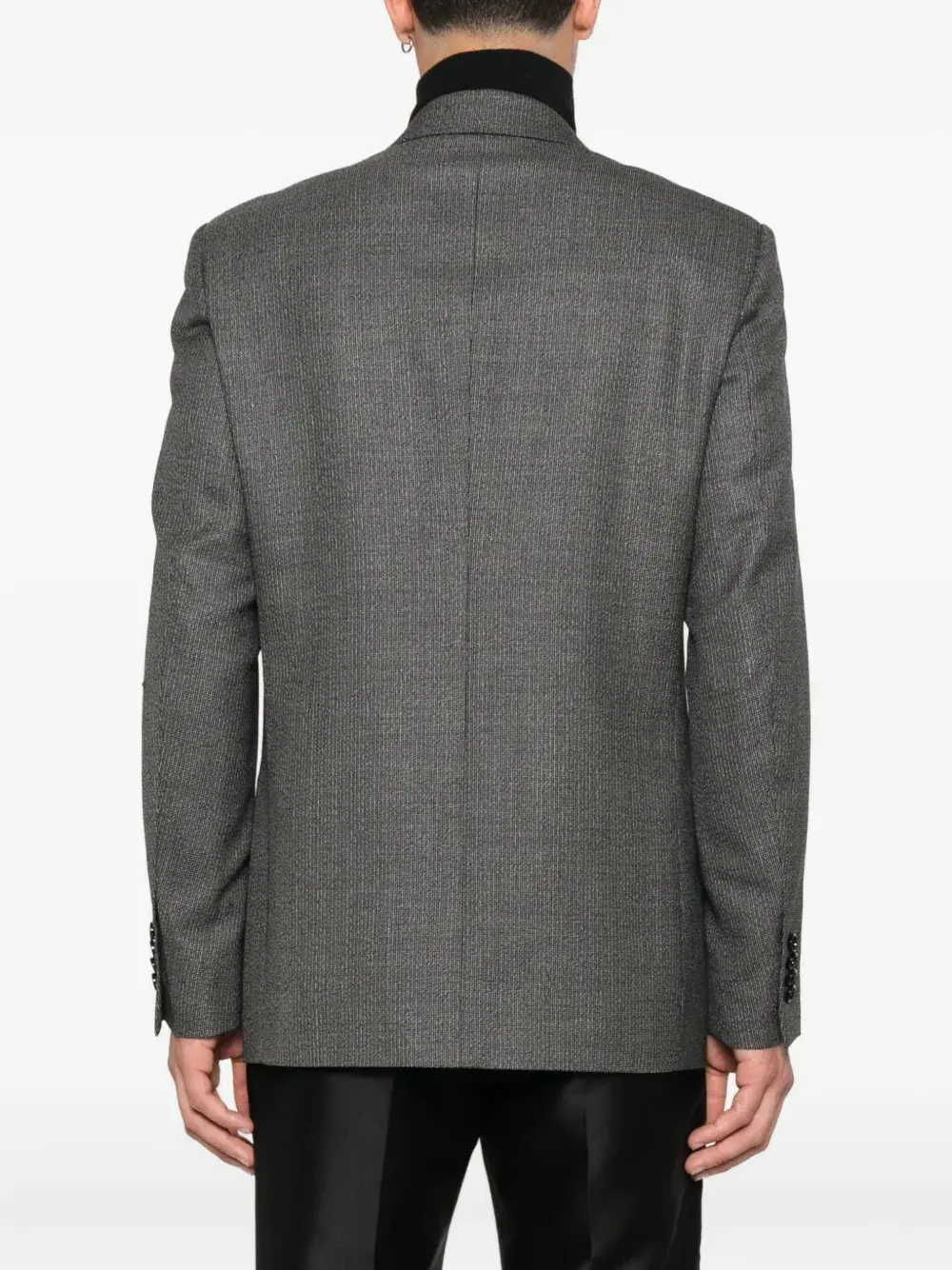 Серый узор в тонкую полоску, двубортный жакет, заостренные лацканы, прорезные карманы, длинные рукава.