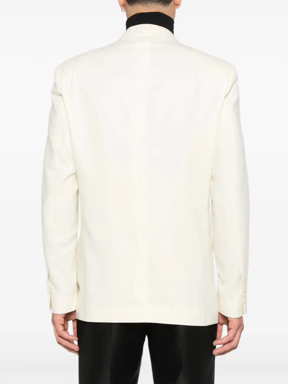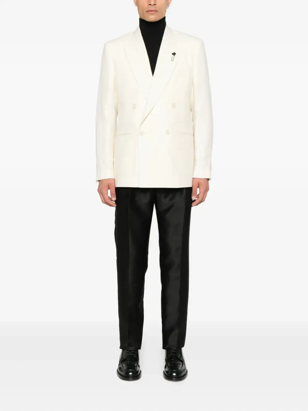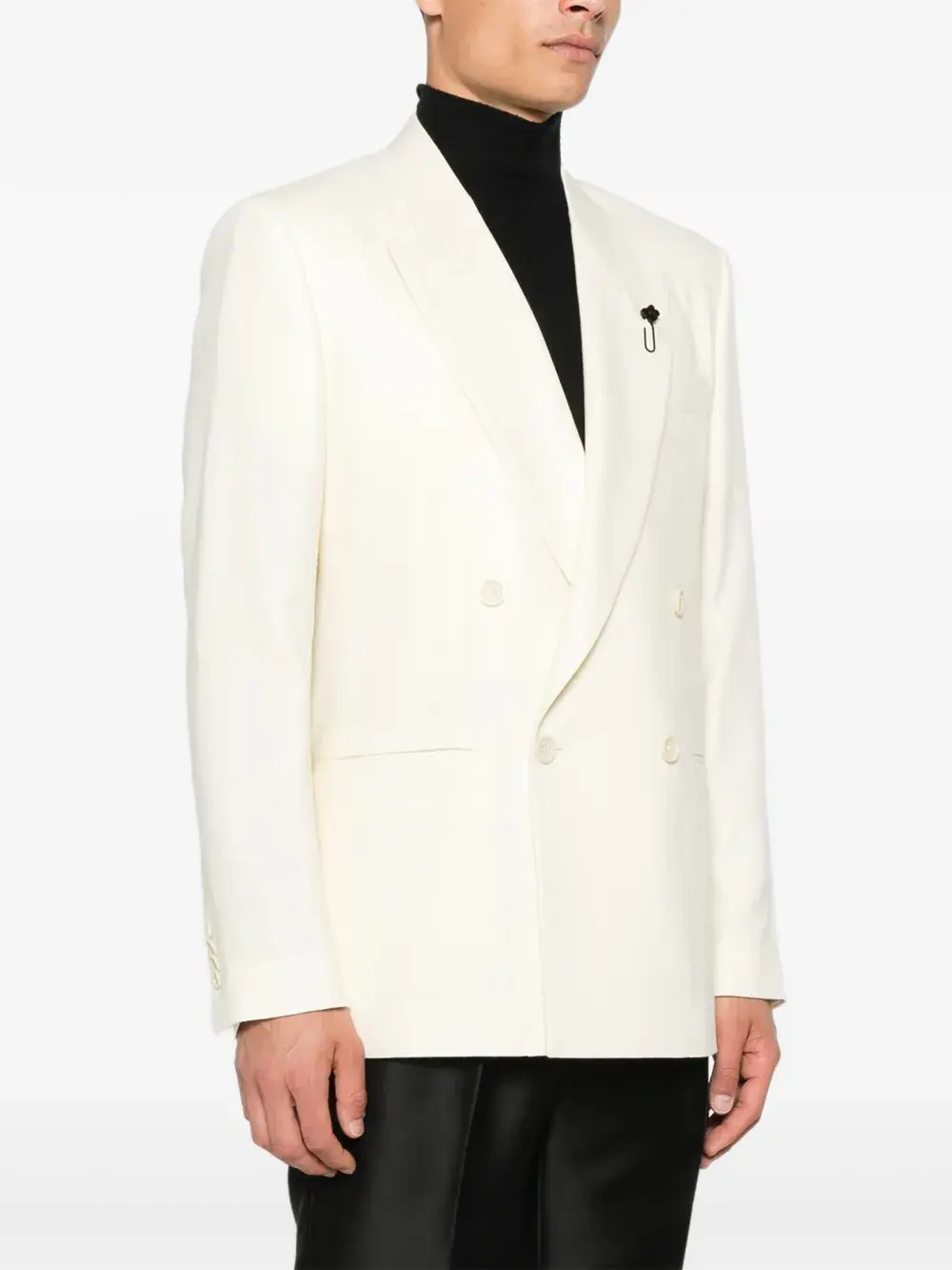 Двубортный пиджак кремового цвета с заостренными лацканами, застежкой на пуговицы, прорезными карманами и брошью.