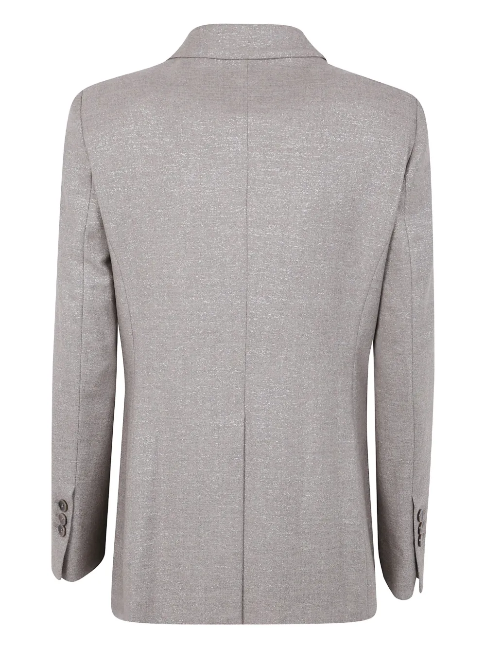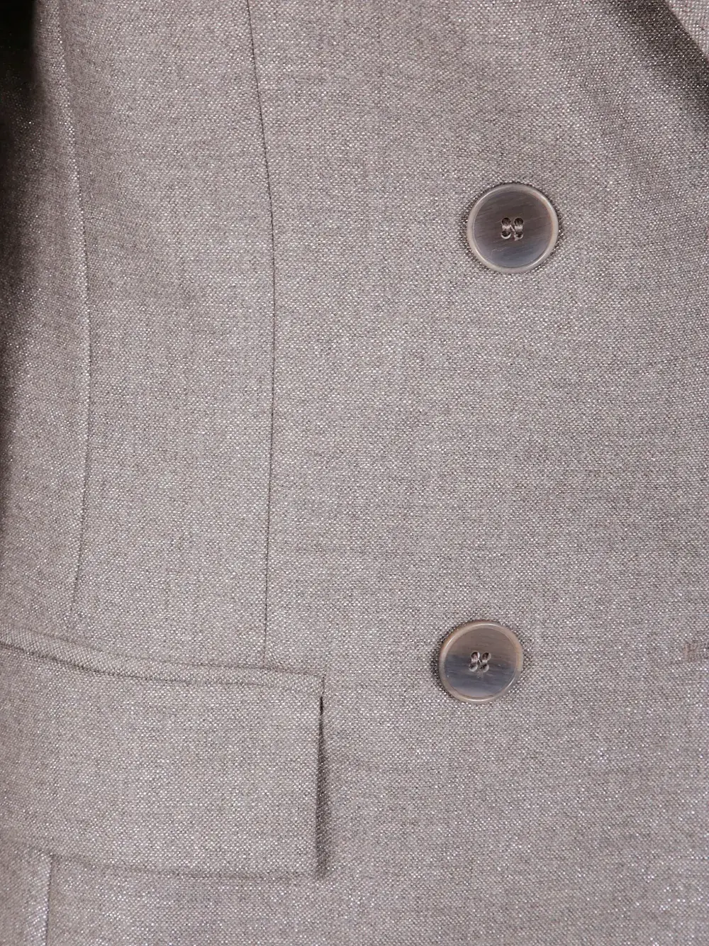 Бежевый двубортный пиджак с заостренными лацканами, карманами с клапанами и длинными рукавами.