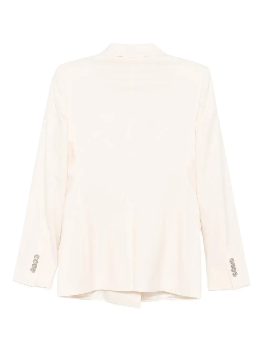 Кремовый двубортный пиджак с застежкой на пуговицы, длинные рукава, манжеты на пуговицах.