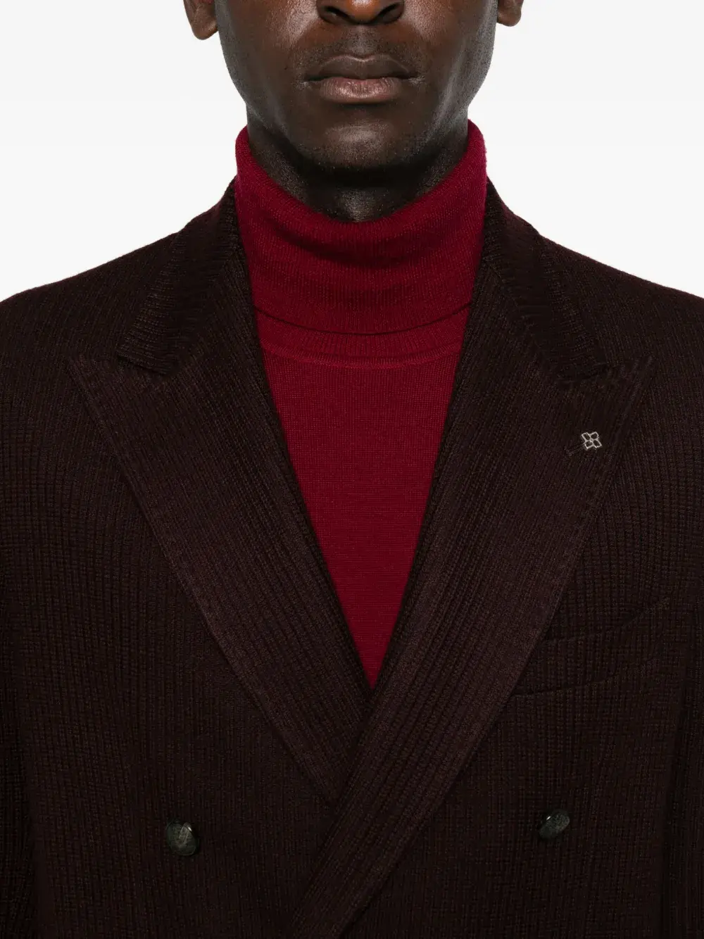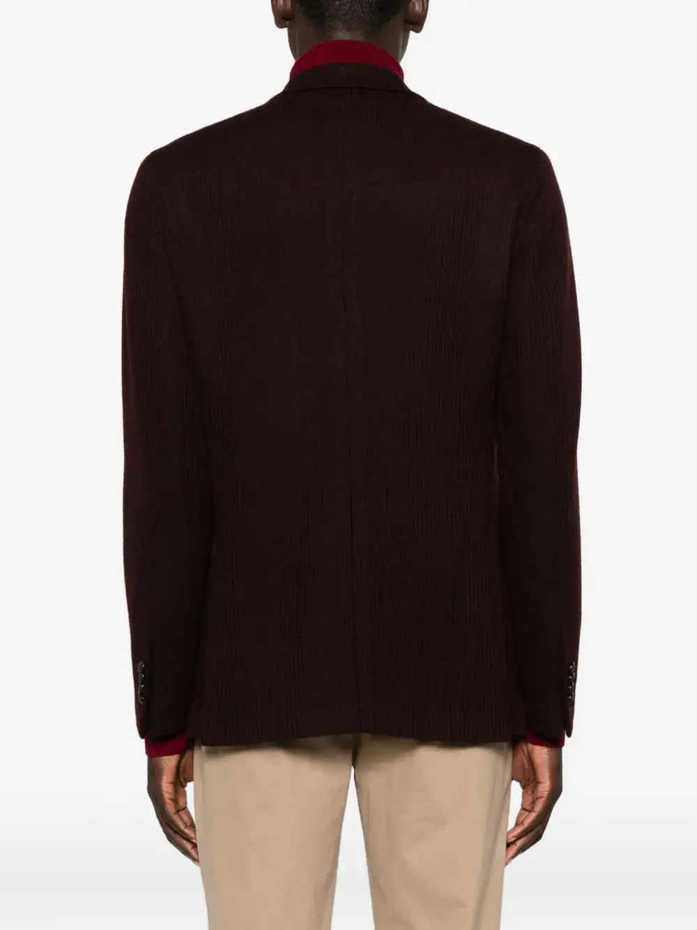 Темно-красный двубортный пиджак с застежкой-клапаном и прорезными карманами.