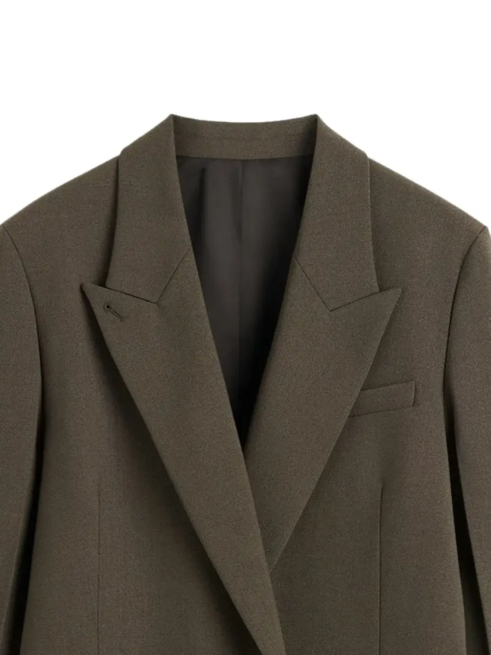 Двубортный пиджак из зеленой шерсти с застежкой на пуговицы, острыми лацканами, длинными рукавами и прорезными карманами.