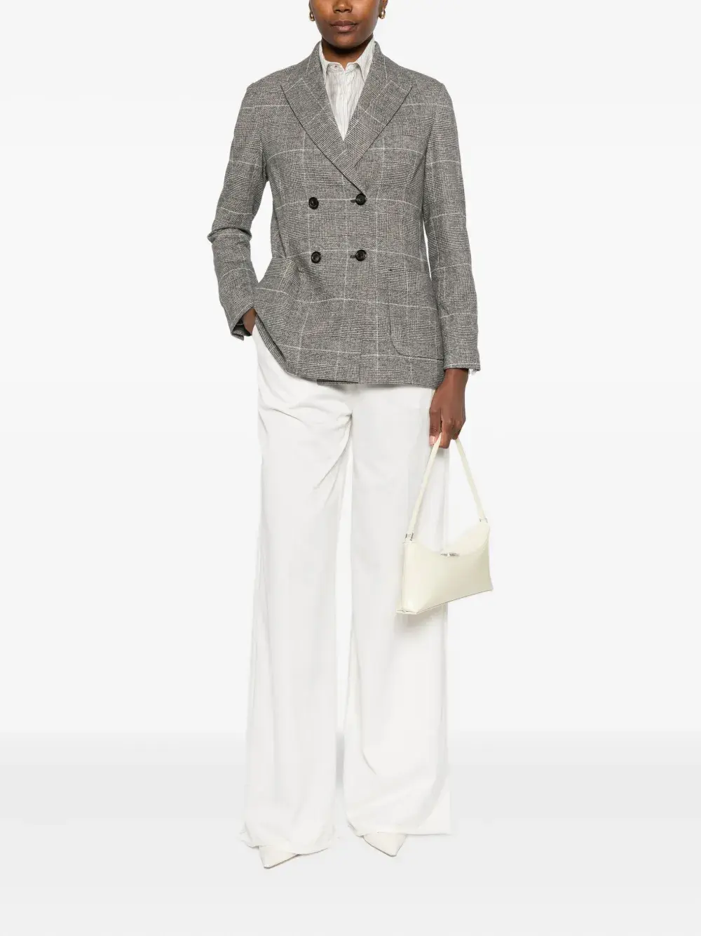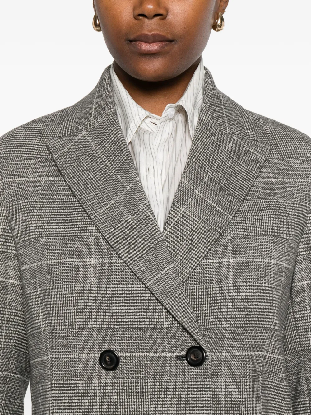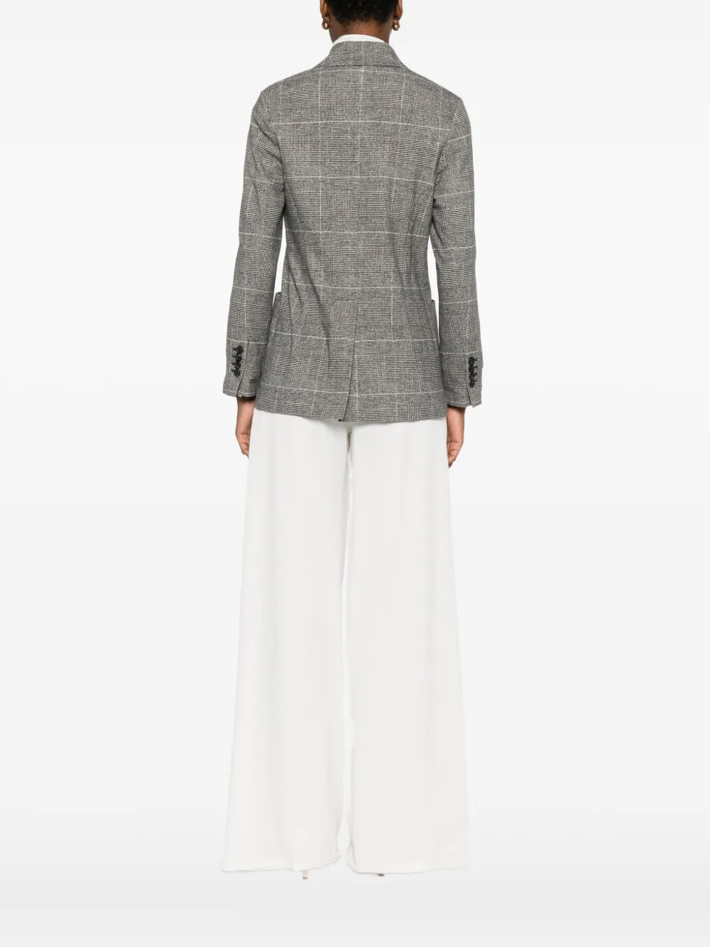 Двубортный пиджак с черно-серым клетчатым узором, застежкой-заостренными лацканами, длинными рукавами и карманами с клапанами.