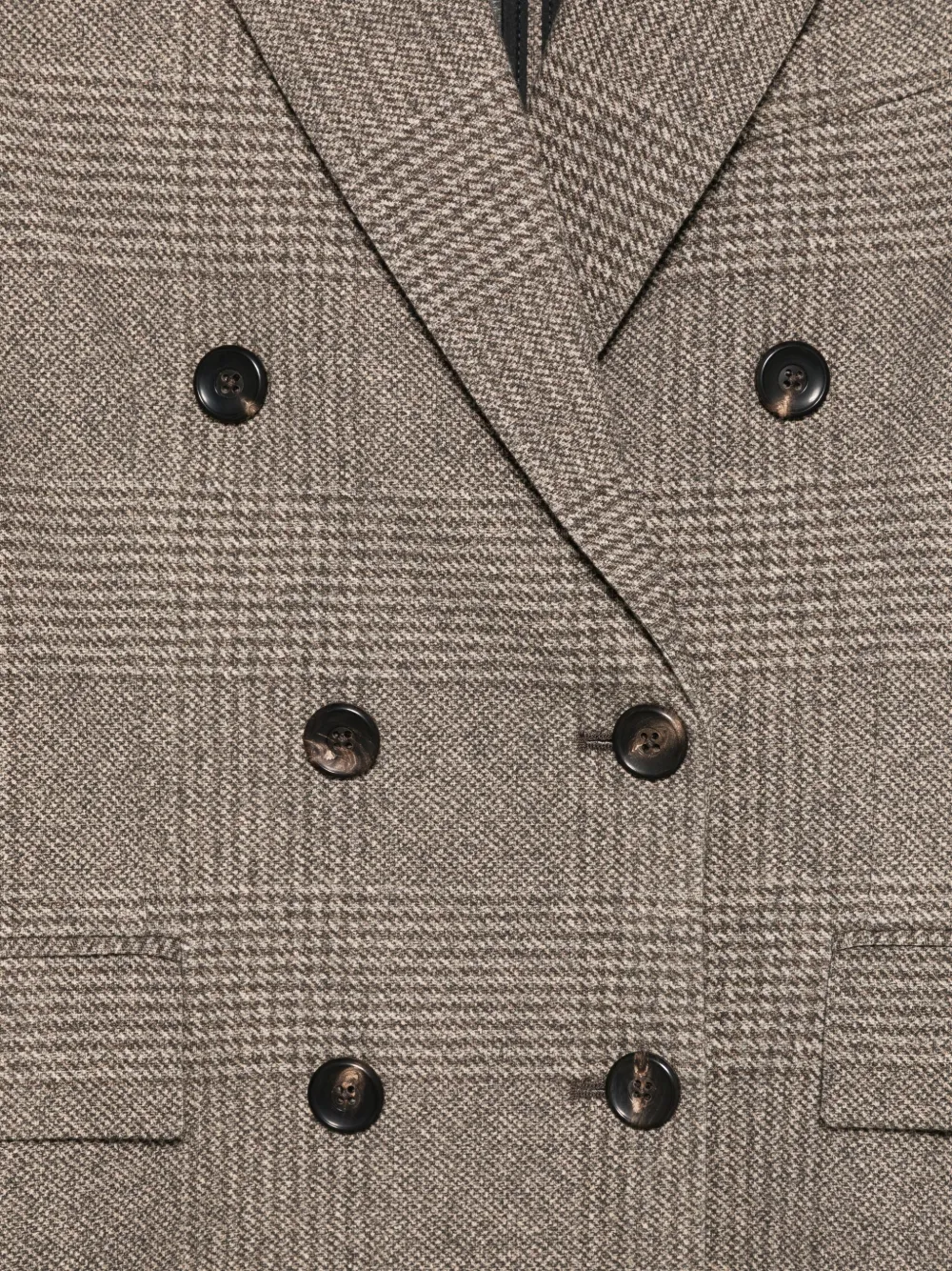 Коричневый клетчатый узор, двубортный, застежка с острыми лацканами, длинные рукава.