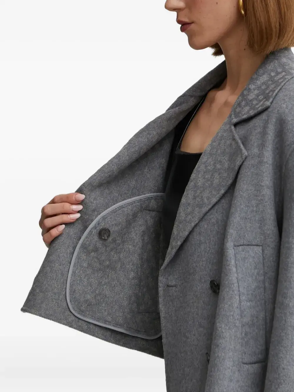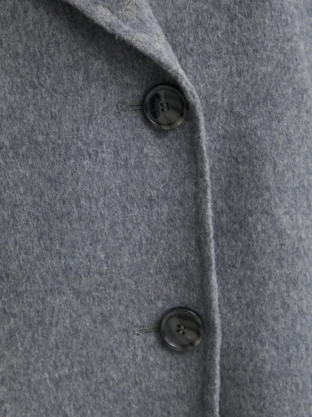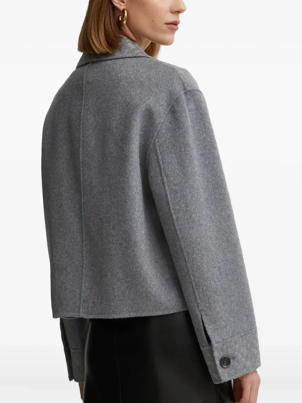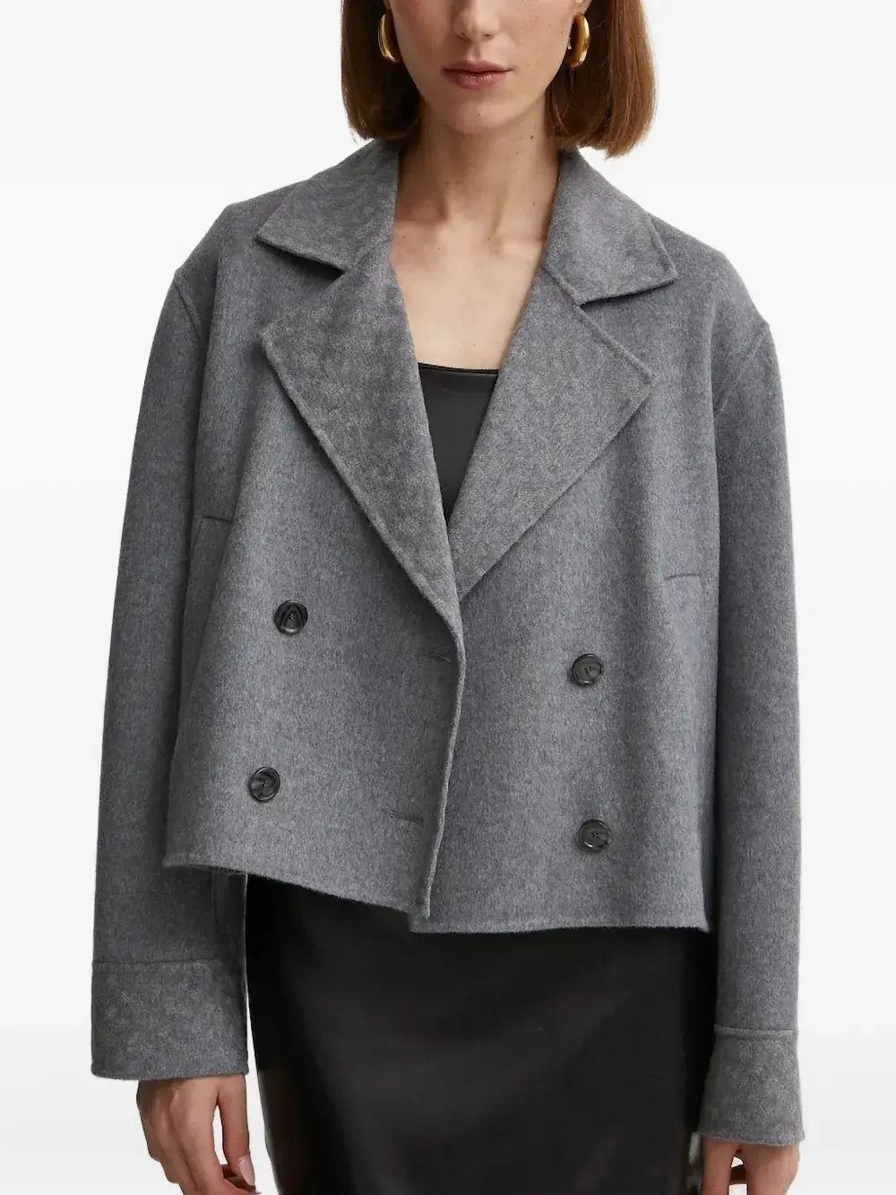 Серая застежка на пуговицы спереди, укороченные отвороты с вырезами, прорезные карманы по бокам.