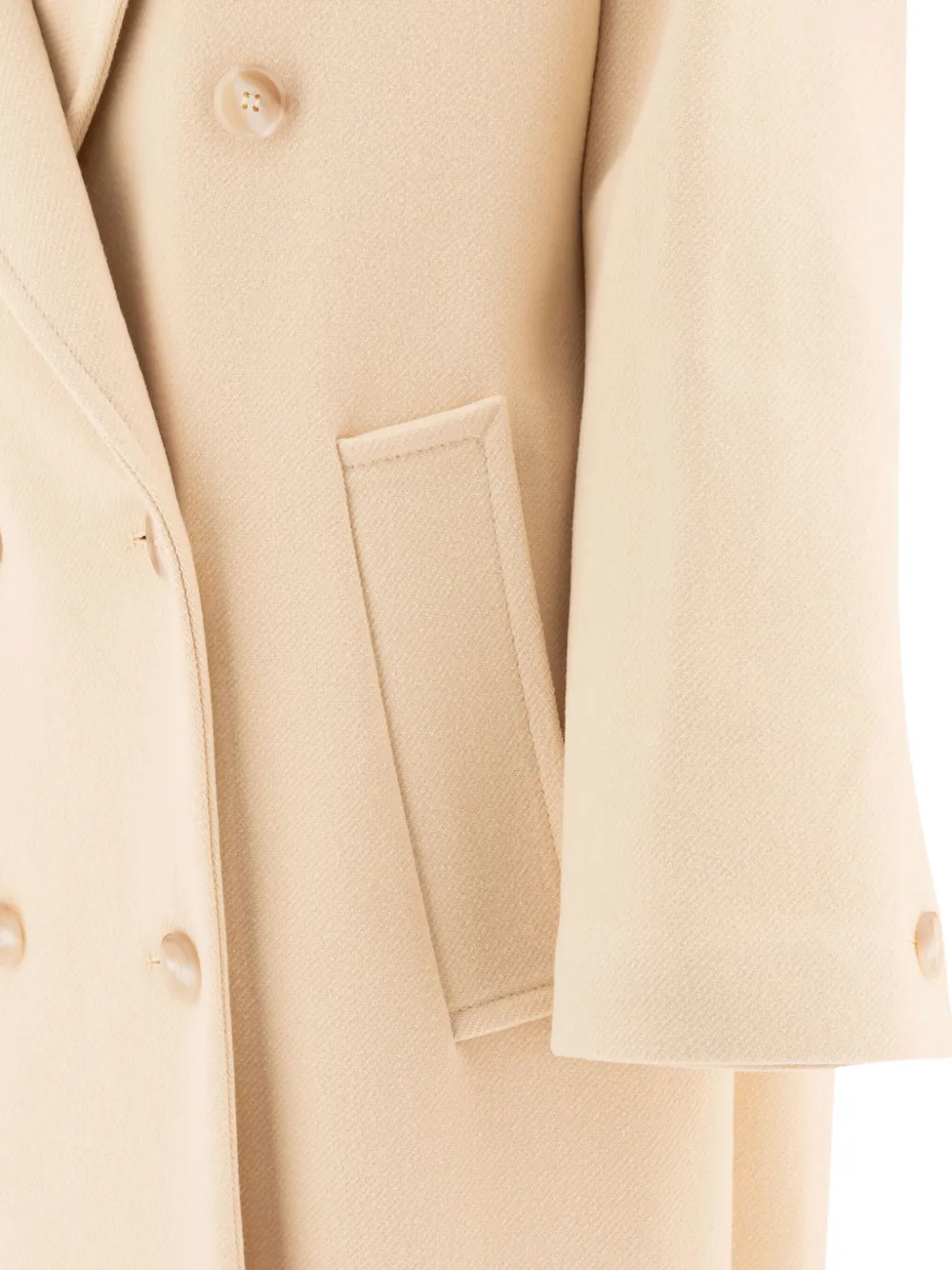 Бледно-желтая двубортная застежка, прорезные карманы, длинные рукава, отделка пуговицами, зазубренные лацканы