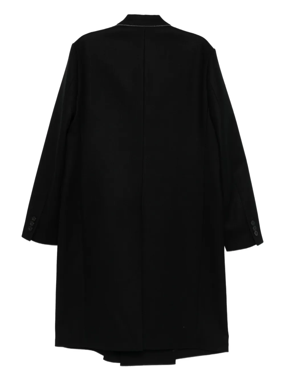 Черный двубортный пиджак с заостренными лацканами, длинными рукавами, манжетами на пуговицах, прямым подолом.