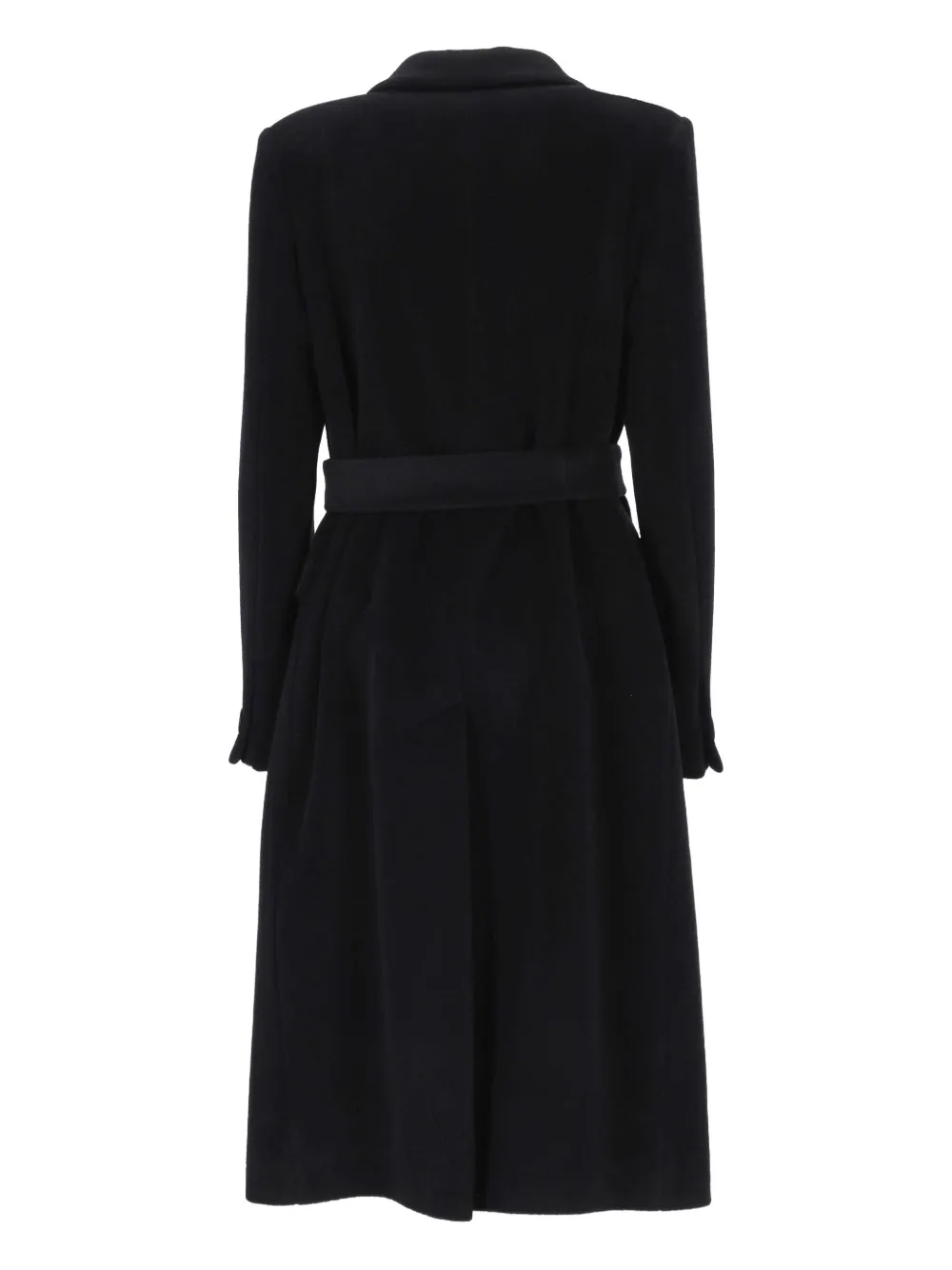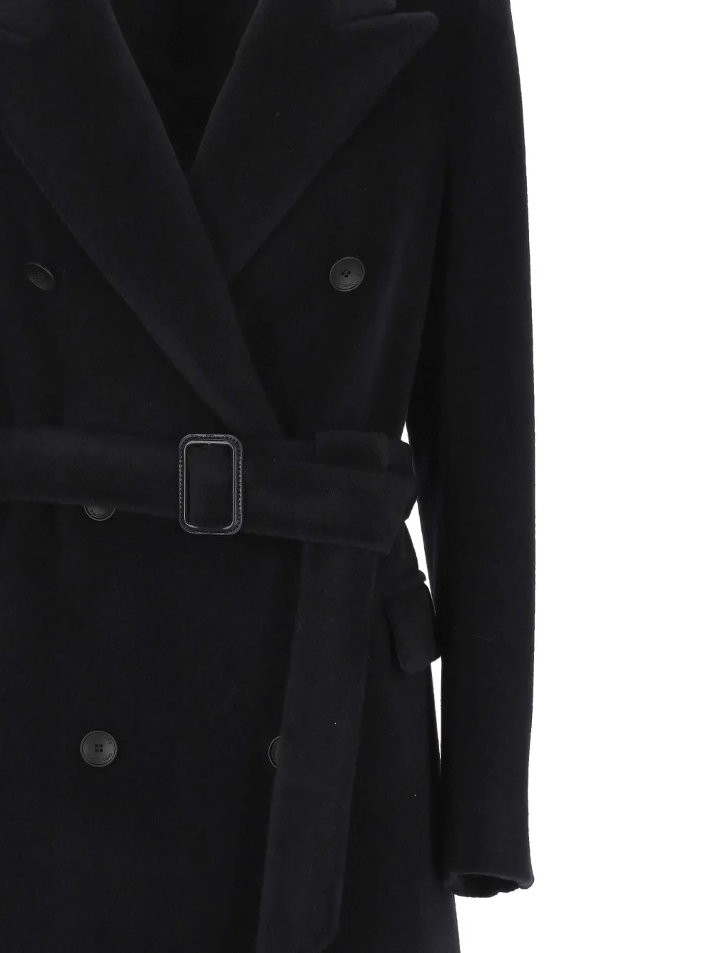 Черный двубортный пиджак с застежкой на пуговицы, поясом на талии, острыми лацканами, длинными рукавами и карманами с клапанами.