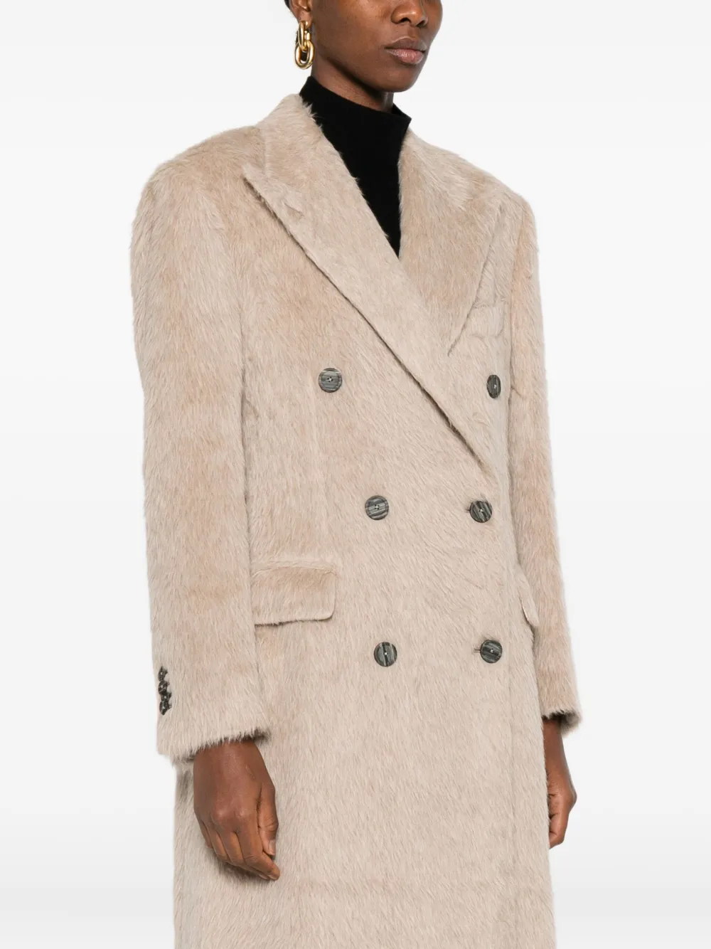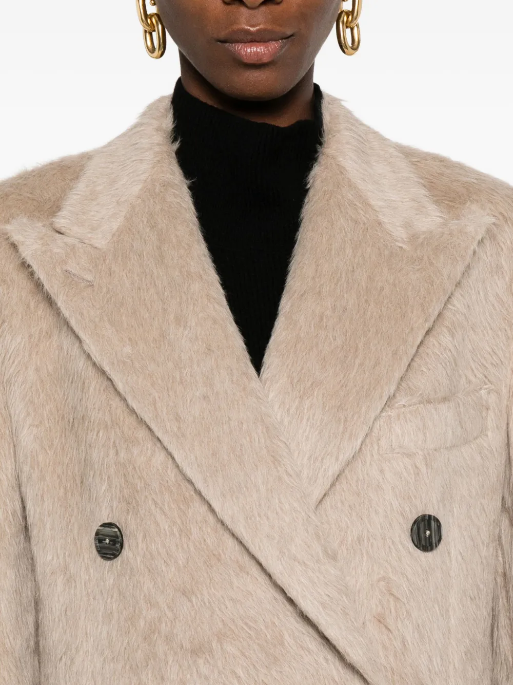 Бежевый двубортный пиджак с застежкой на пуговицы, длинными рукавами и карманами с клапанами.