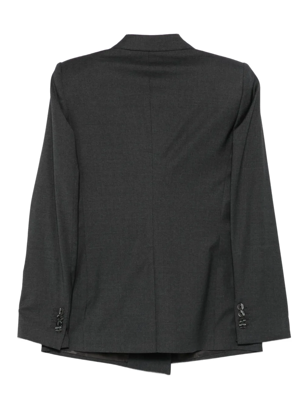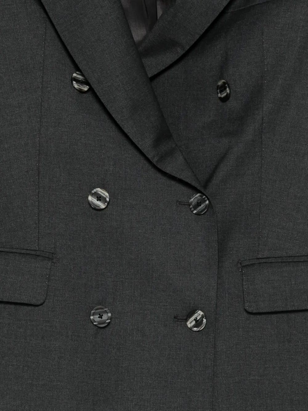 Темно-серый двубортный пиджак с застежкой на пуговицы, острыми лацканами, длинными рукавами, карманами с клапанами и манжетами на пуговицах.