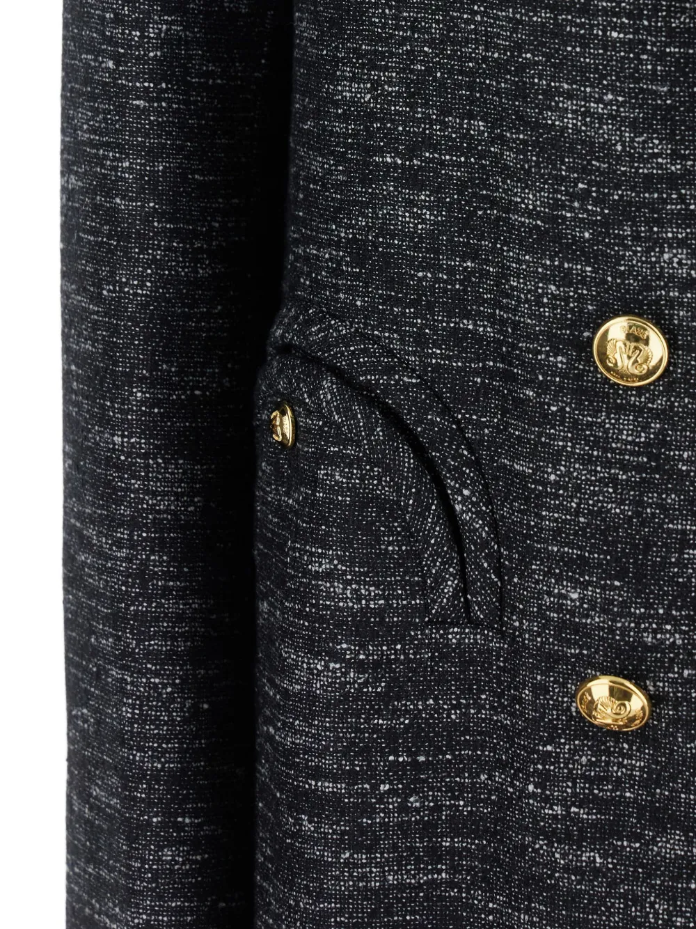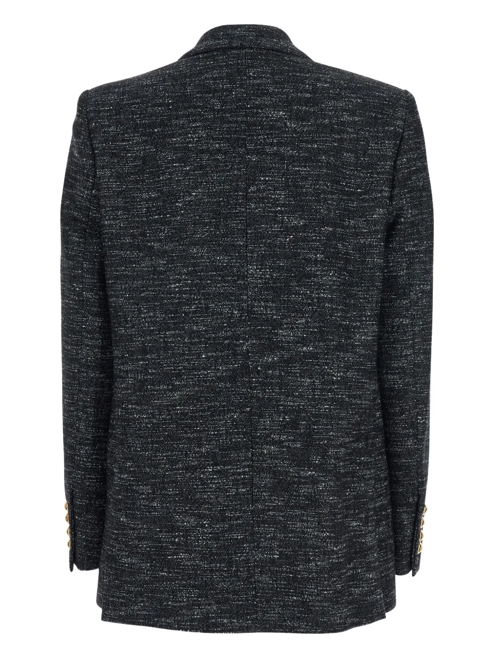 Серый двубортный пиджак, застежка на золотистые пуговицы, карманы с клапанами, структурированные плечи.