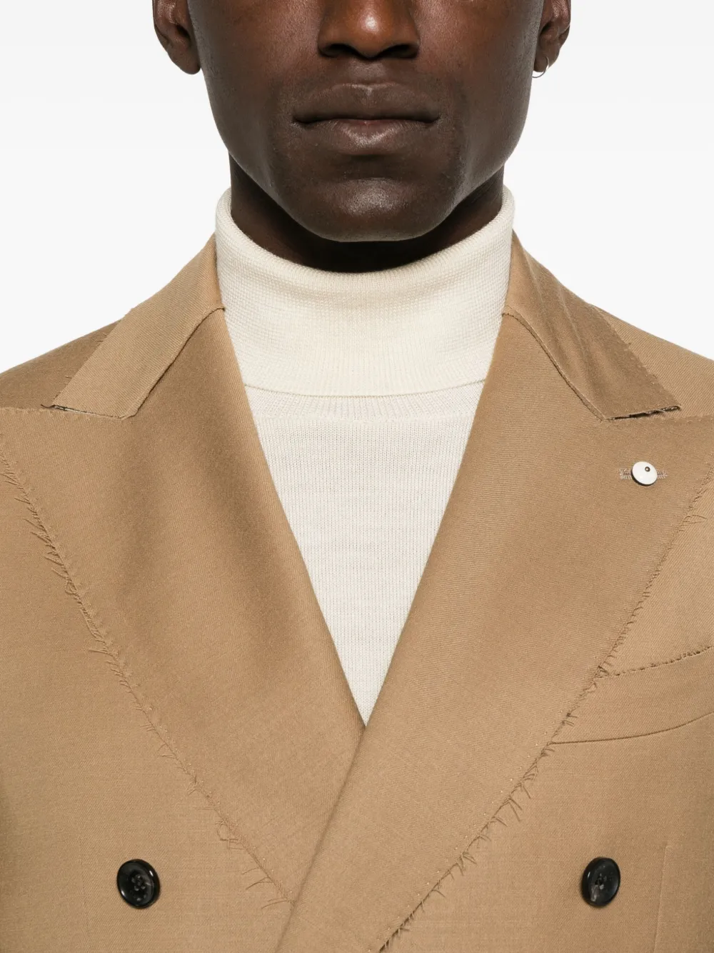 Коричневый двубортный пиджак с застежкой на пуговицы, необработанными краями, карманами с клапанами, застегивающимися на пуговицы манжетами.