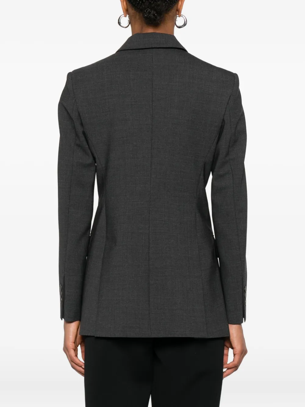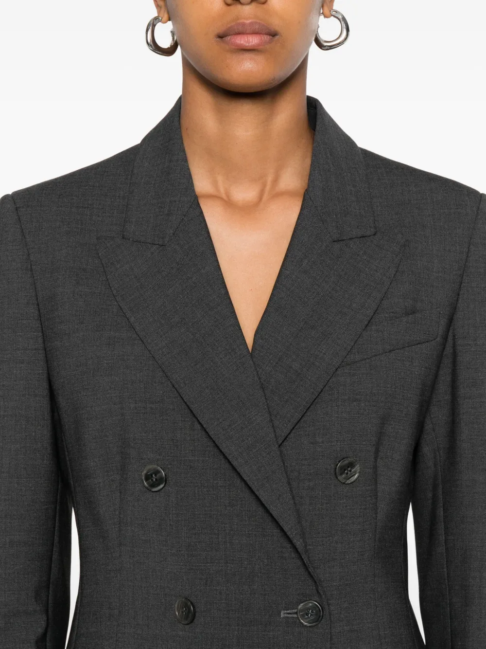 Серый двубортный пиджак с застежкой на пуговицы, отложным воротником, длинными рукавами и прямым подолом.