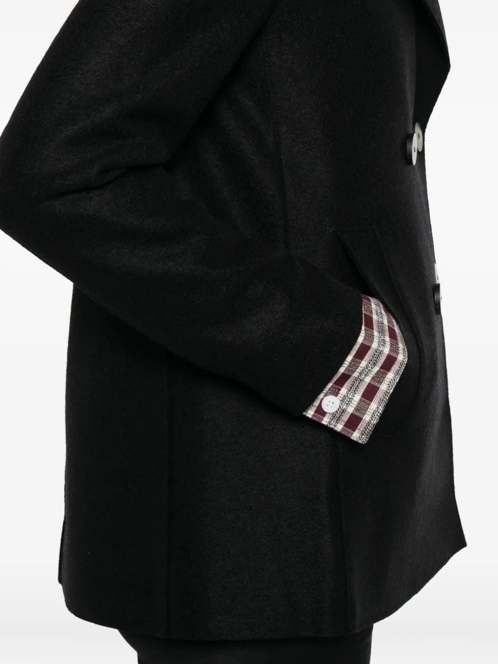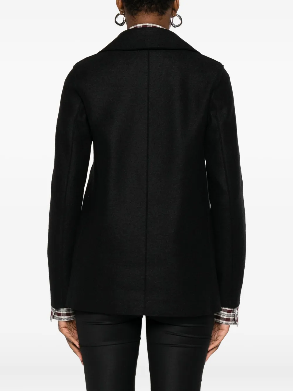 Черная двубортная застежка, отложной воротник, прорезные карманы, длинные рукава.