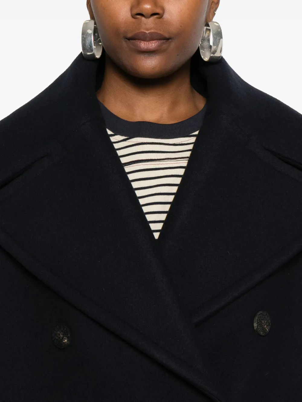 Двубортный пиджак темно-синего цвета с застежкой на пуговицы, накладными карманами, широкими отложными лацканами, длинными рукавами.