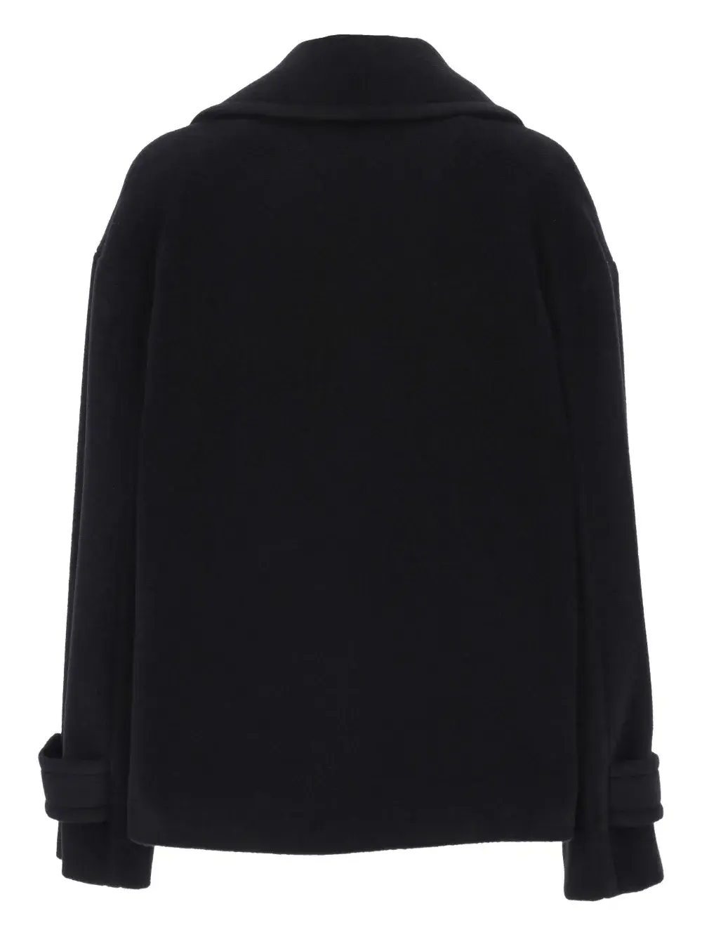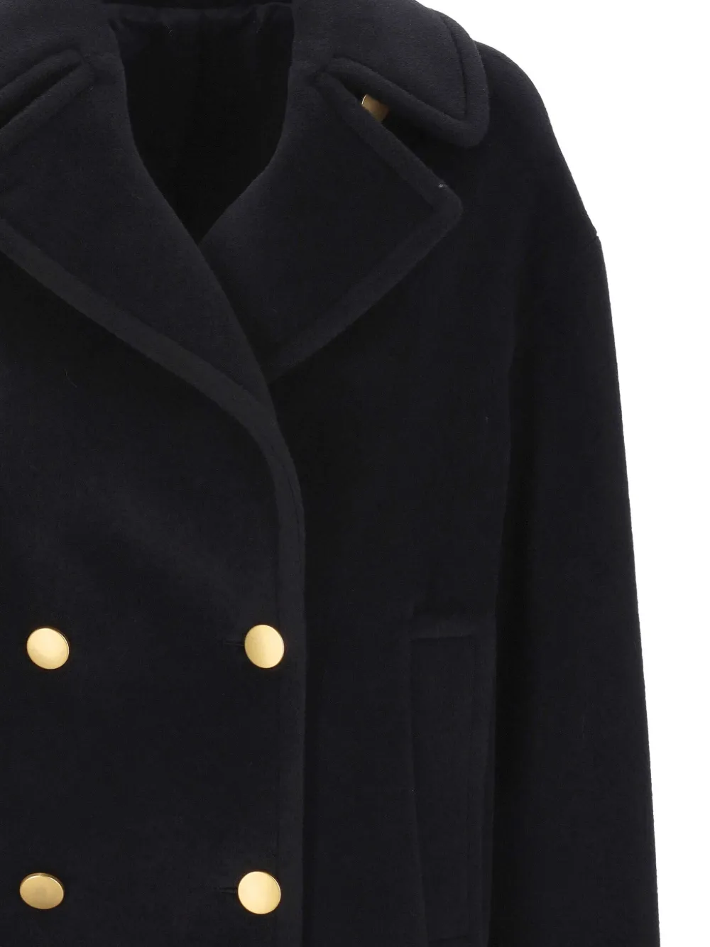 Двубортный пиджак из черной шерсти с застежкой на пуговицы, золотистыми пуговицами и прорезными карманами.