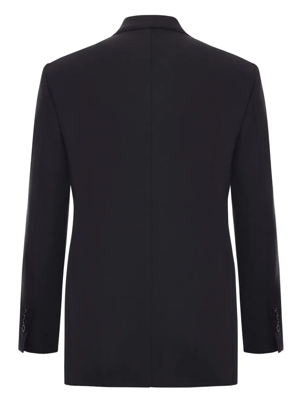 Черный двубортный пиджак с заостренными лацканами, застежка на плечи с подкладкой, длинные рукава, застегивающиеся на пуговицы манжеты, прорезные карманы