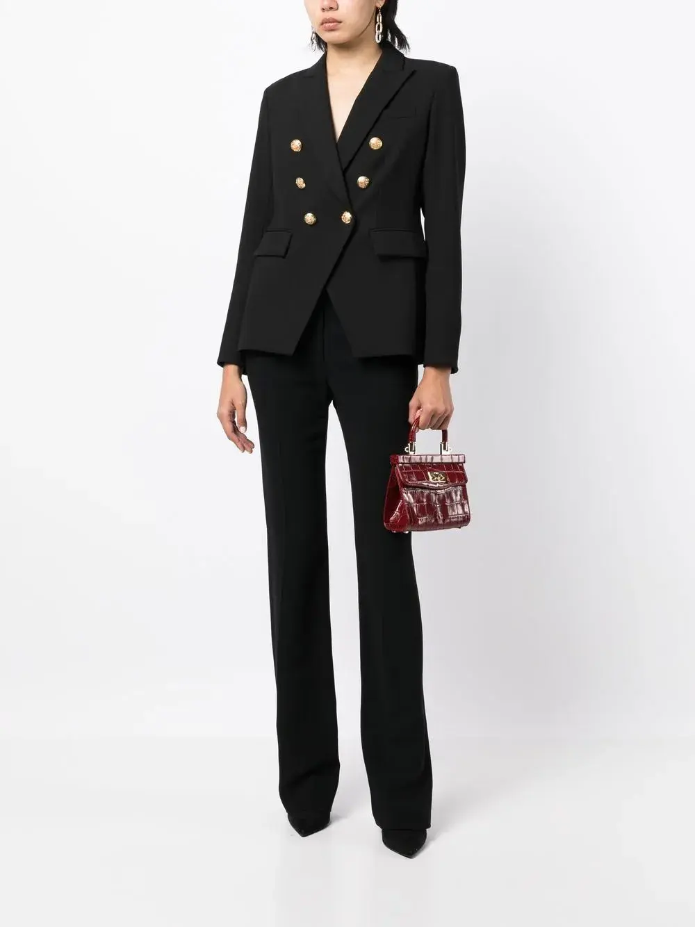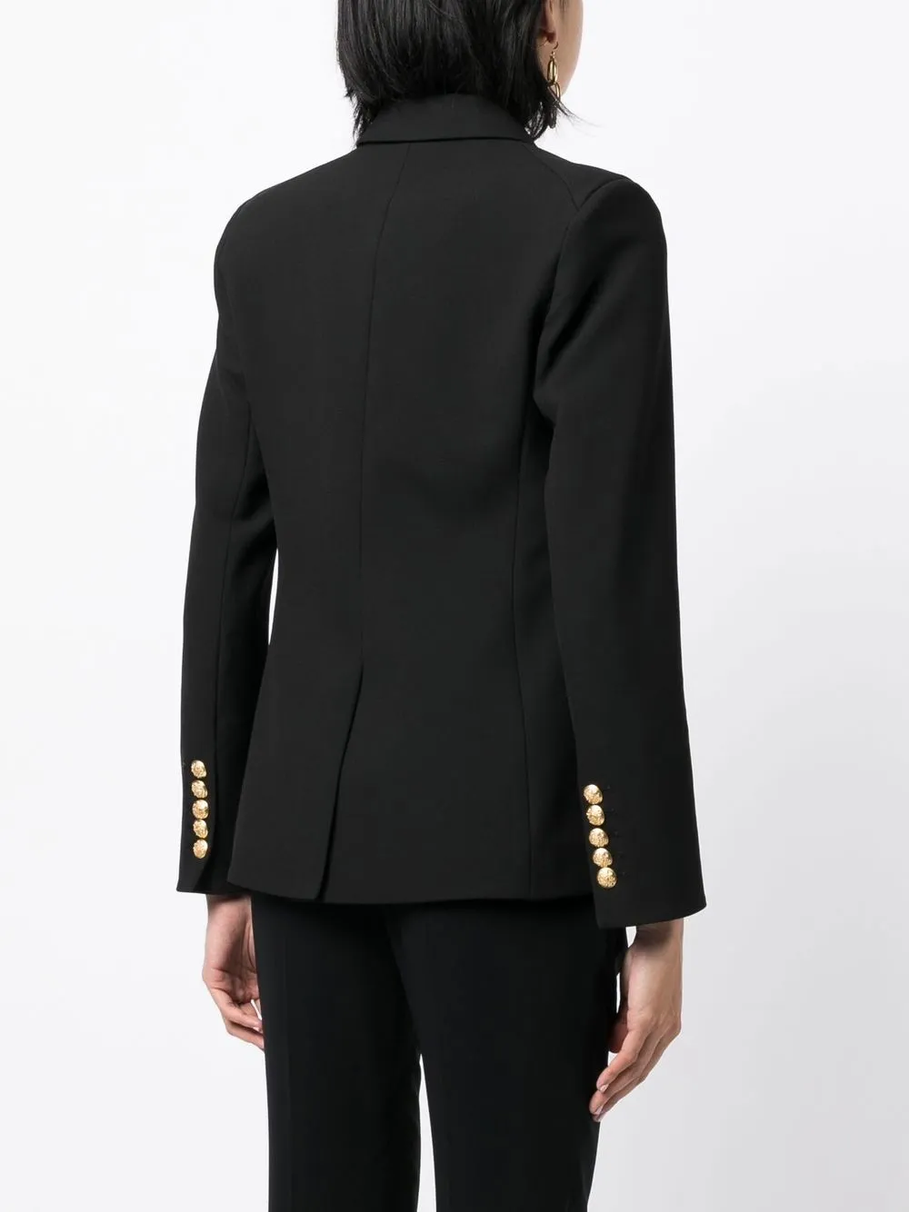 Черный, эластичный хлопок, золотистые пуговицы, заостренные лацканы, двубортная застежка на кнопки, два прорезных кармана спереди, длинные рукава, манжеты на пуговицах, шлица по центру сзади и строгий крой.
