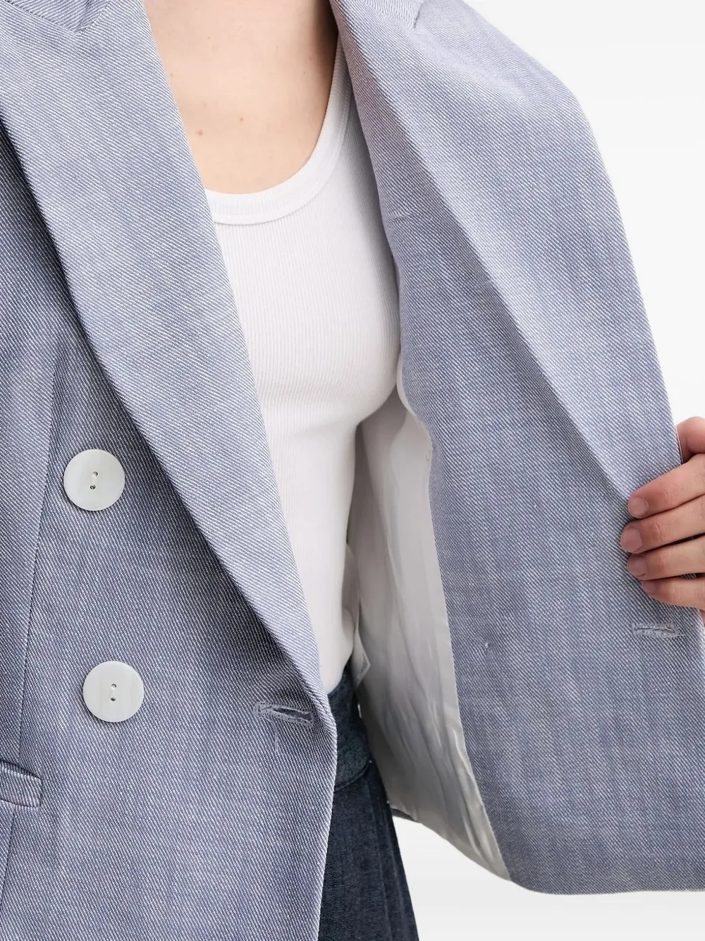 Светло-голубой двубортный пиджак с узором «ёлочка» и заострёнными лацканами.