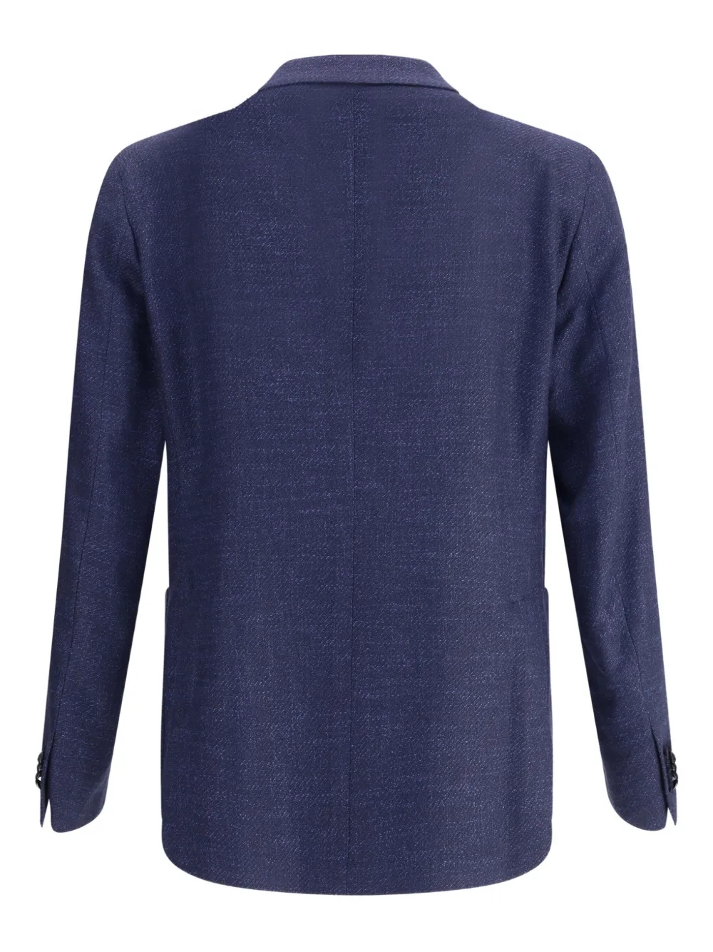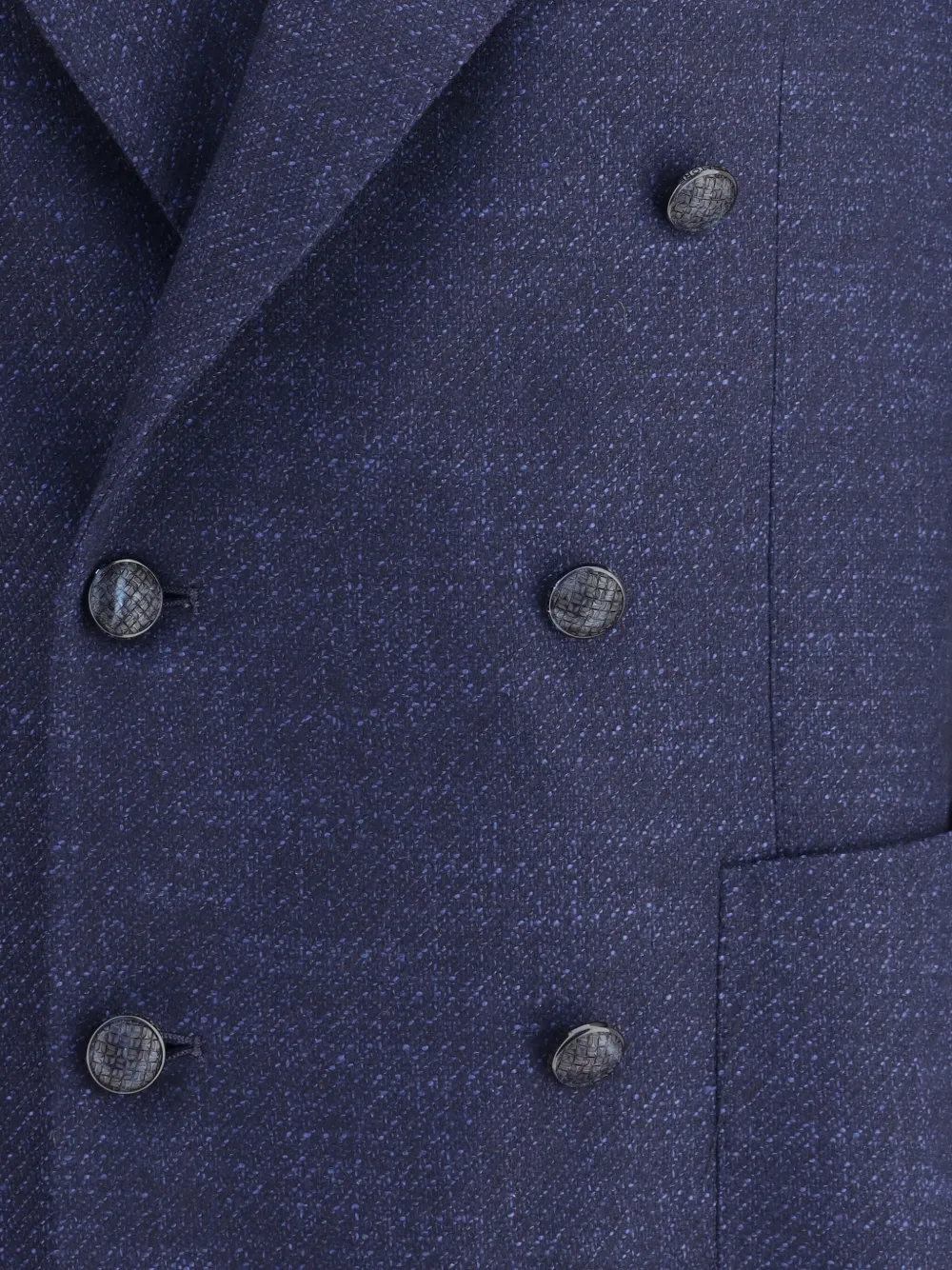 Темно-синий двубортный пиджак с застежкой, накладными карманами и зазубренными лацканами.