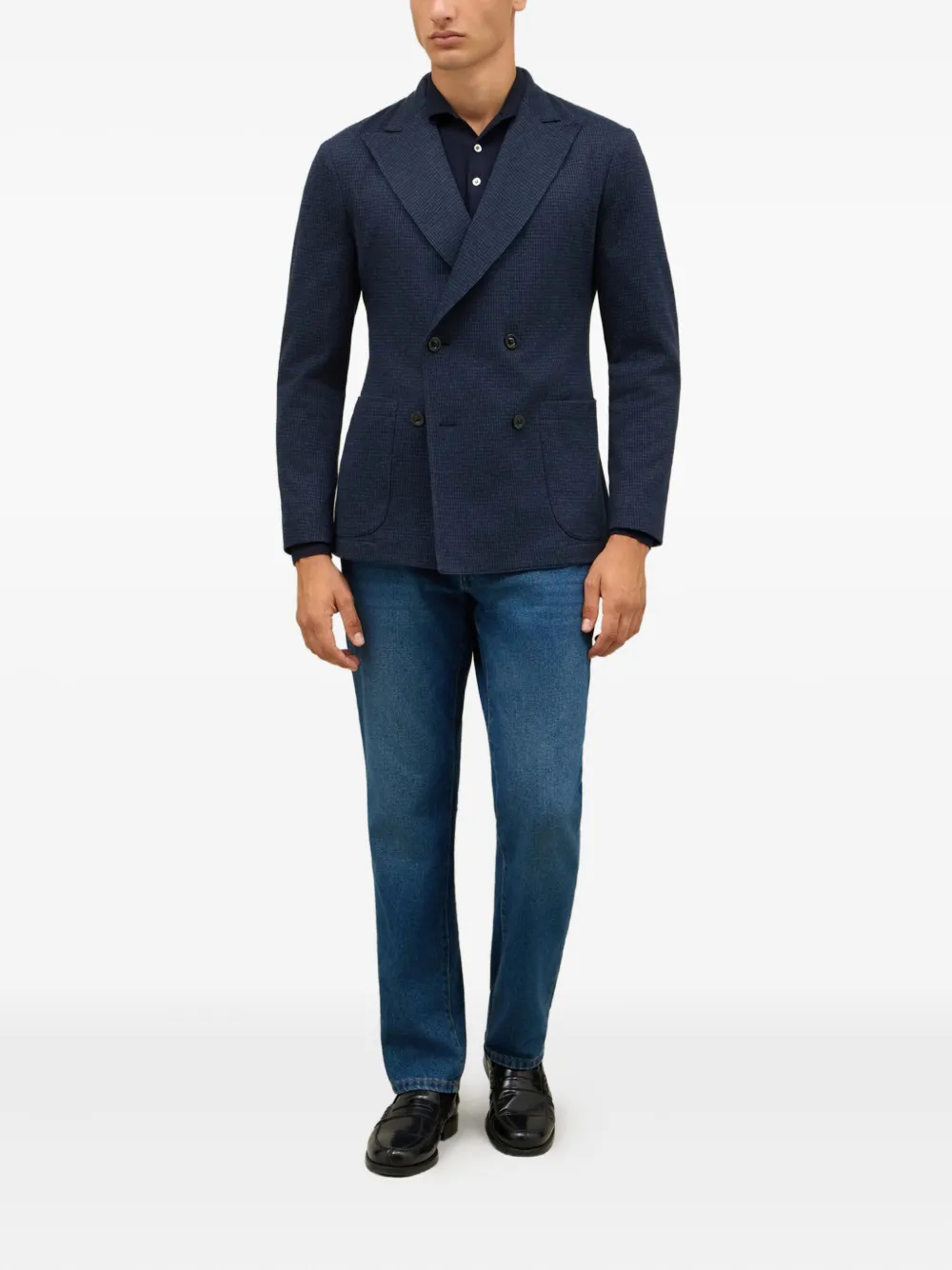 Двубортный пиджак темно-синего цвета с застежкой, накладными карманами, отложными лацканами и длинными рукавами.