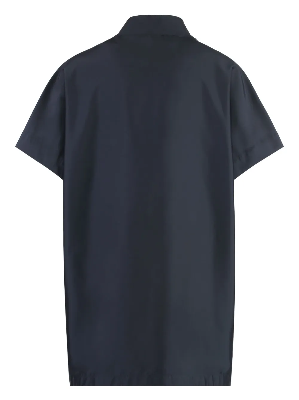 Двубортный пиджак темно-синего цвета с короткими рукавами и прямым подолом.
