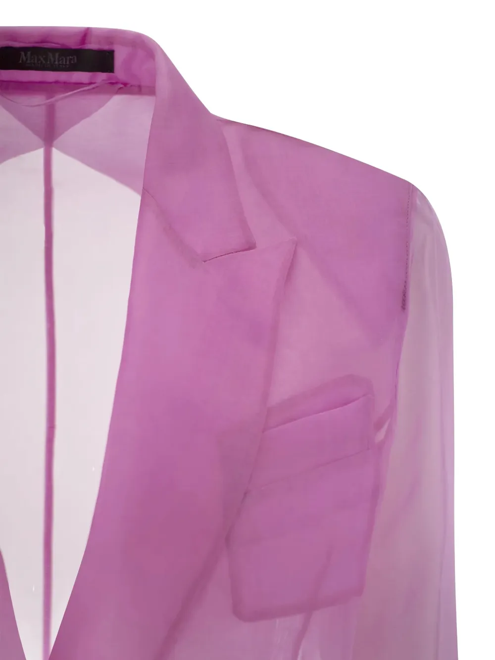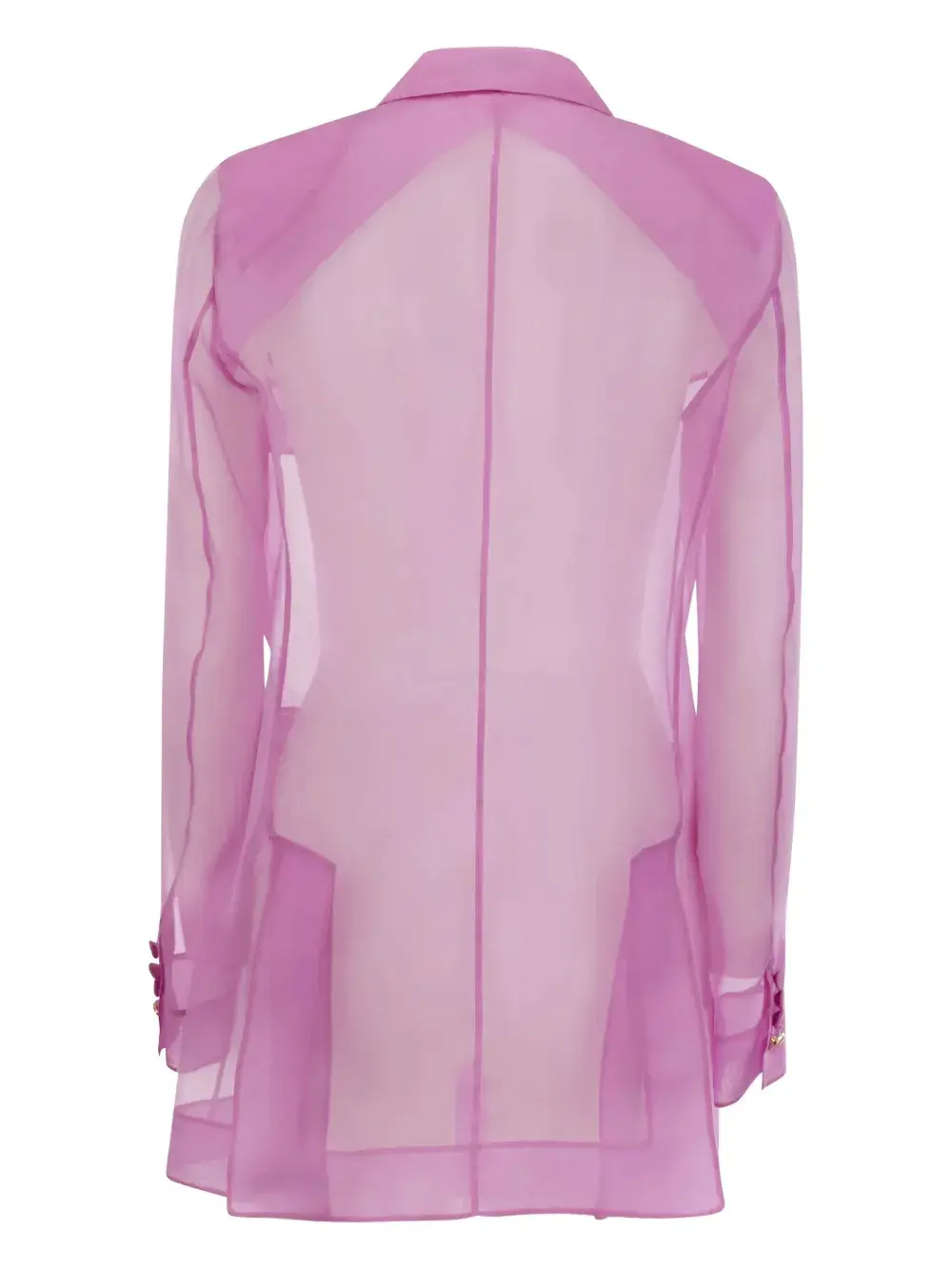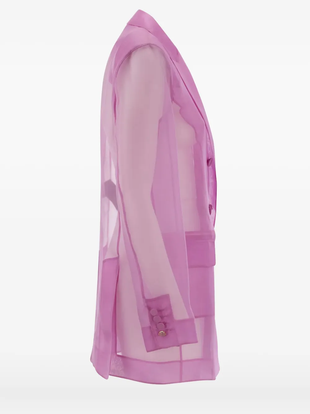 Двубортный пиджак из светло-фиолетового шелка с накладными карманами и прозрачными длинными рукавами.