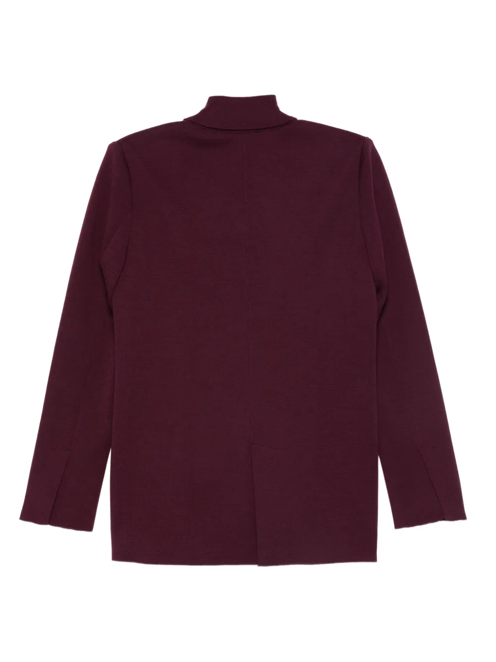 Двубортный пиджак из натуральной шерсти бордового цвета с застежкой, отложным воротником, длинными рукавами и прямым подолом.
