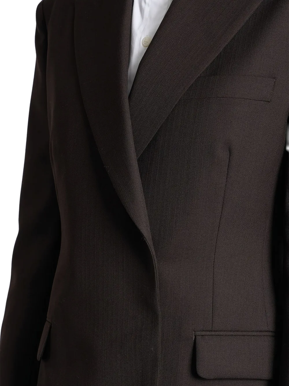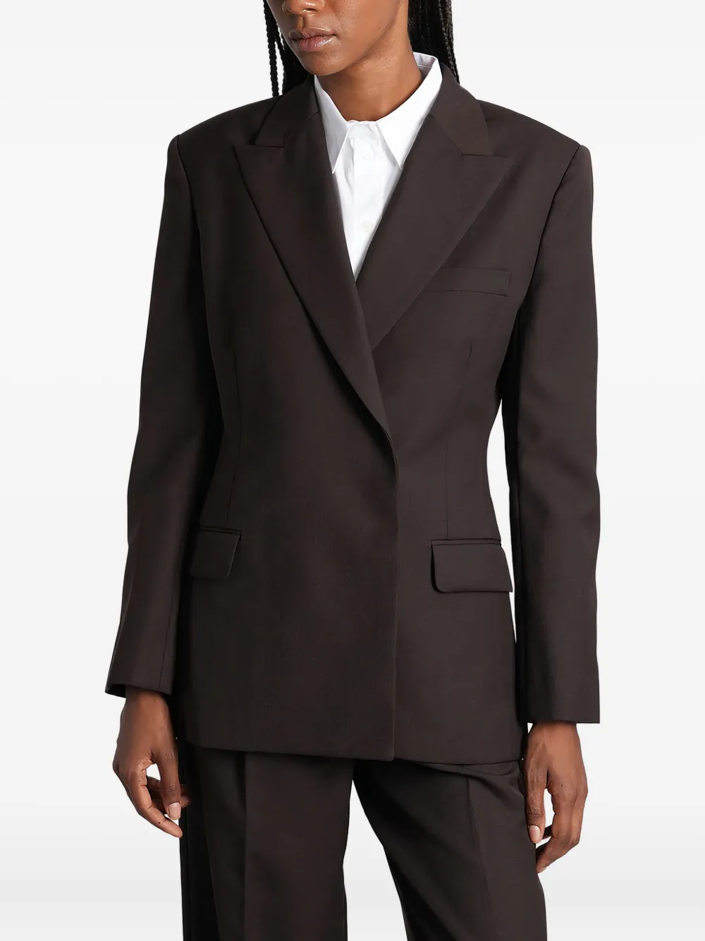 Коричневый двубортный пиджак, заостренные лацканы, прорезные карманы, подбитые плечи, прямой подол.