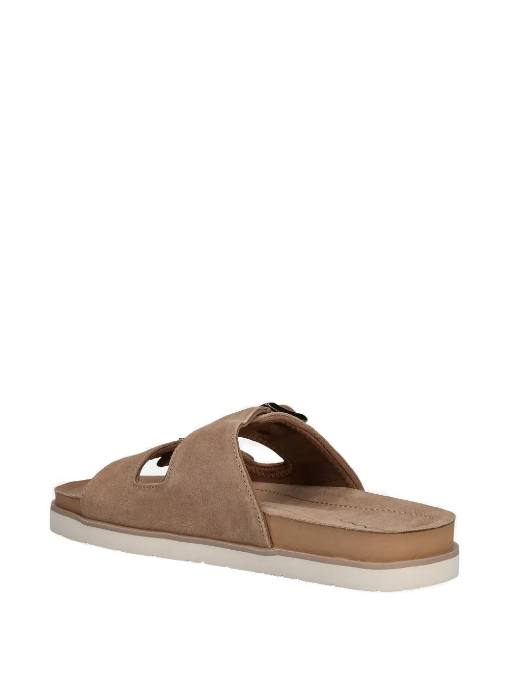 Верх из светло-коричневой замши, застежка на две пряжки, плоская подошва, логотип.