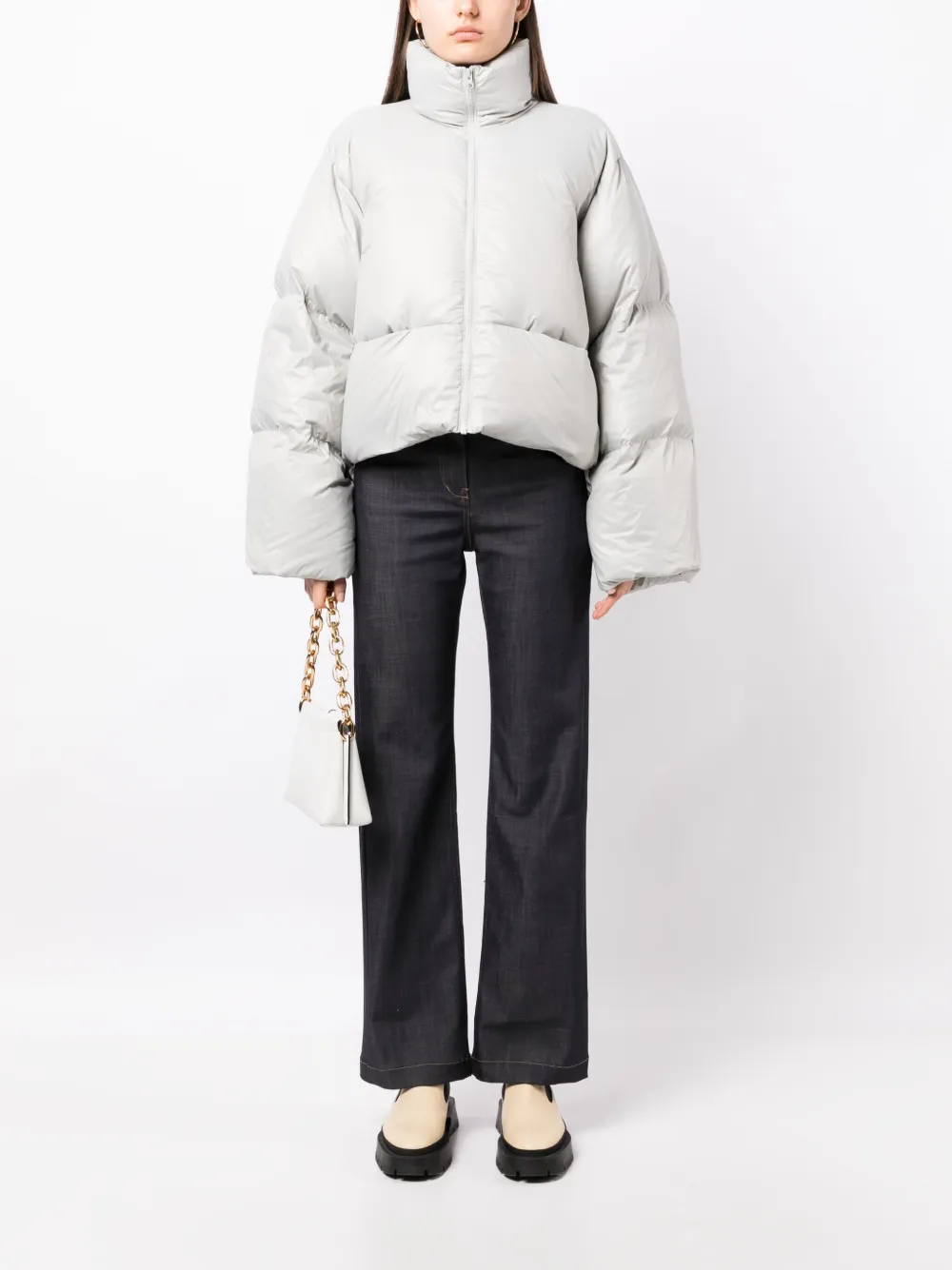 Утиный пух, дутый материал, высокий воротник, застежка на молнии спереди, длинные рукава и прямой подол.