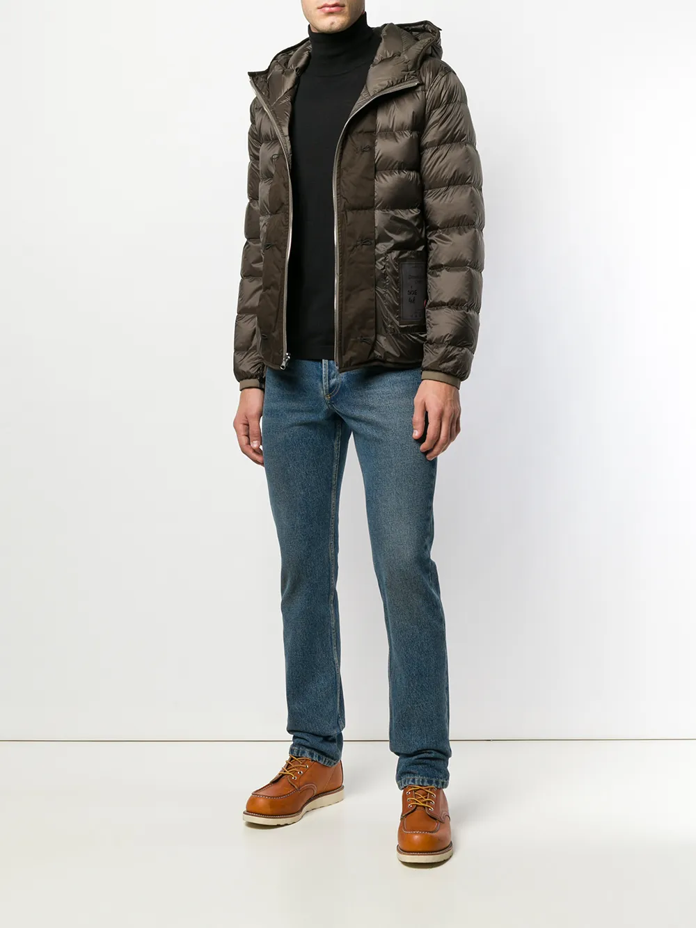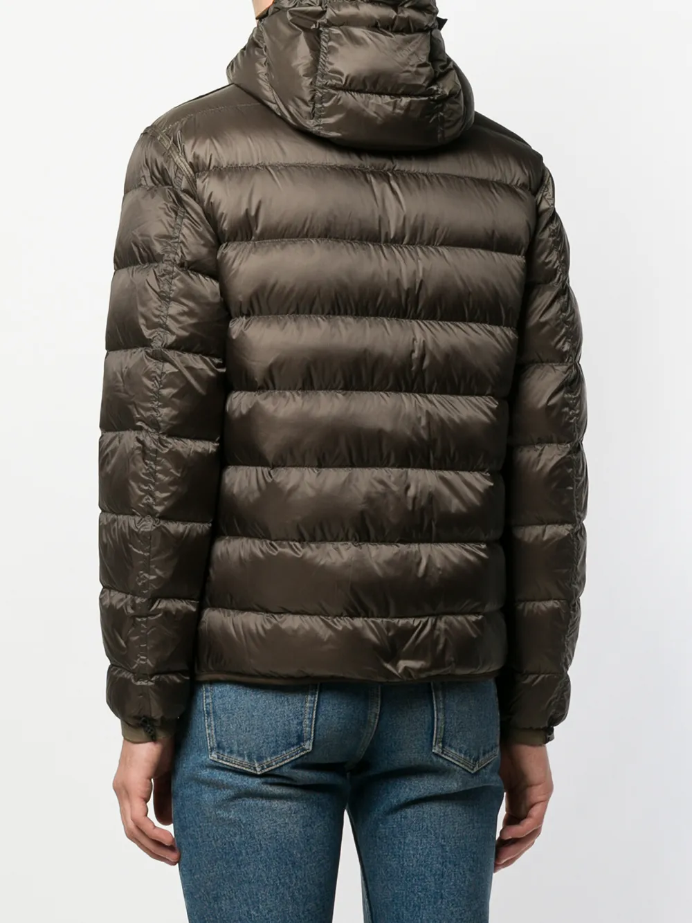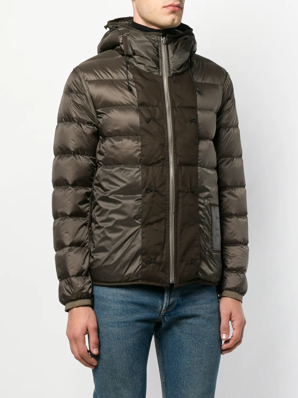 Зеленая хлопковая пуховая куртка с перьевым наполнителем и капюшоном от Ten C. Стеганый эффект, капюшон, застежка на кнопках и молнии, длинные рукава, узкие манжеты, короткая длина.