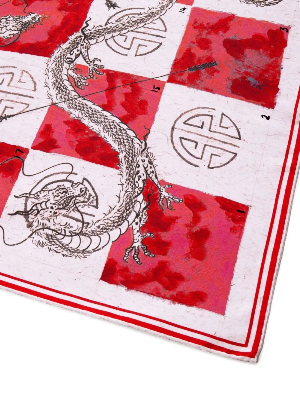 Красный дракон, мотив стрелы, красная кайма, клетчатый узор, шелковый материал