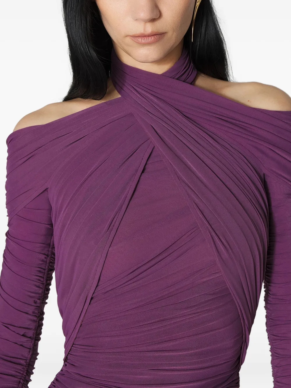 Фиолетовый, с перекрестным вырезом, драпировкой, длинными рукавами, облегающим лифом.