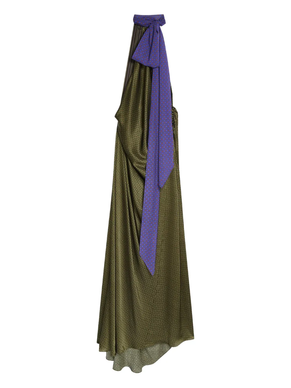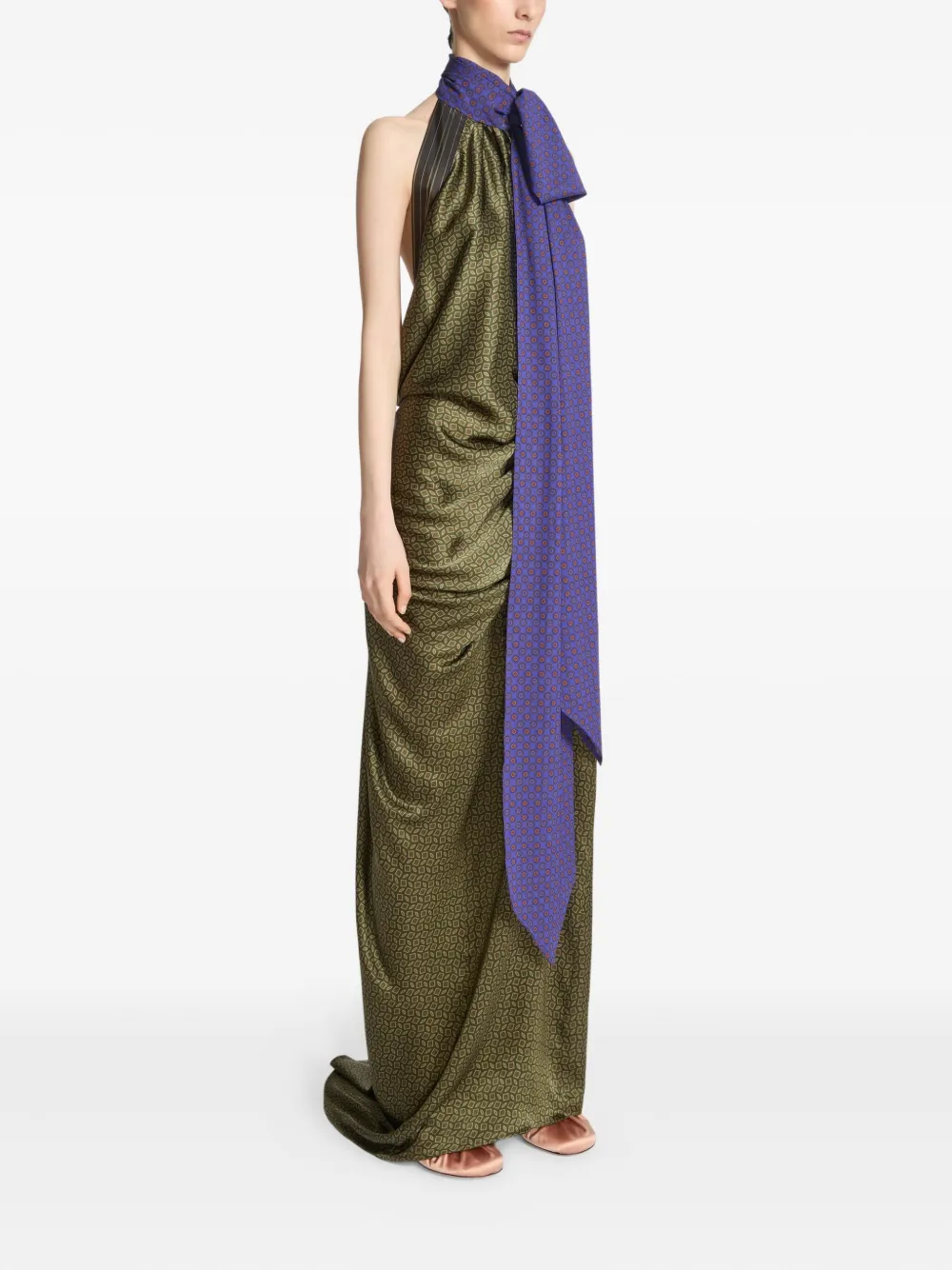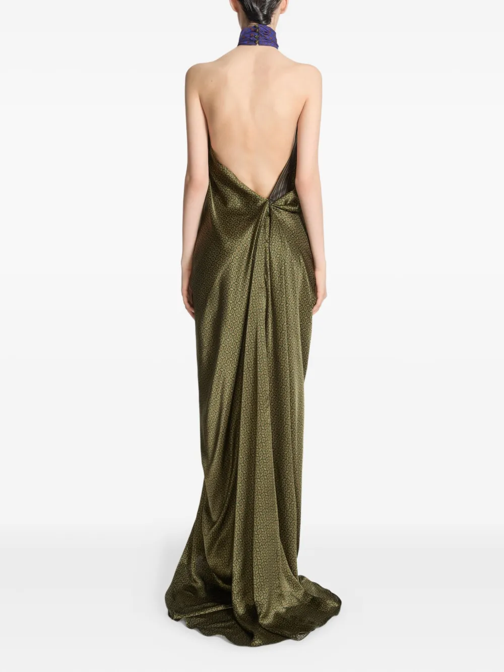 Платье с геометрическим принтом зеленого цвета, драпировкой и вырезом-халтером, макси-длина