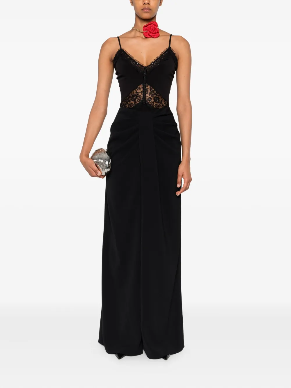 Черная драпировка спереди, потайная застежка-молния, прямой подол.