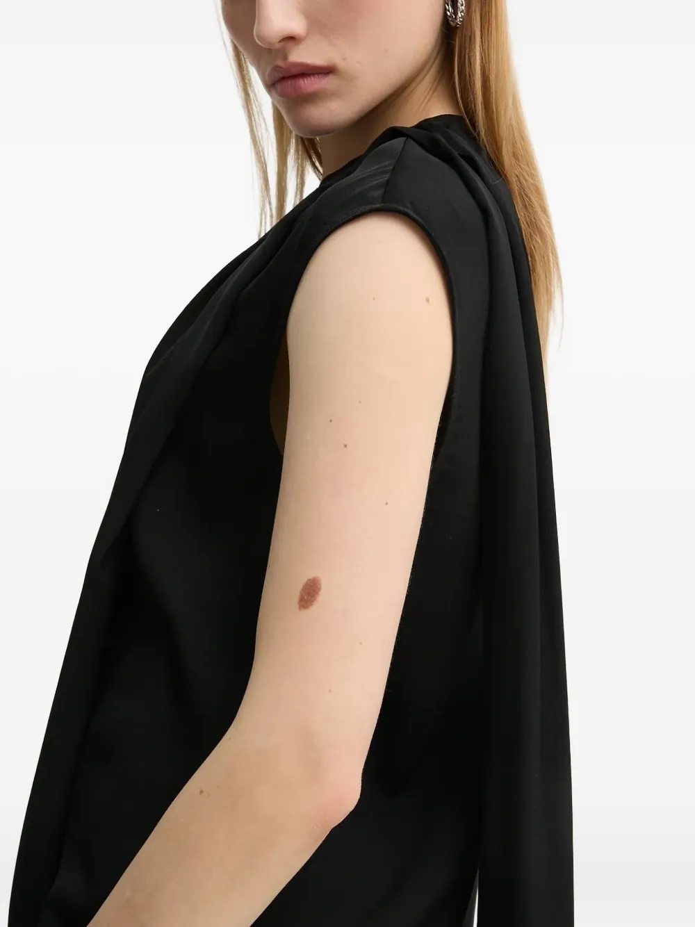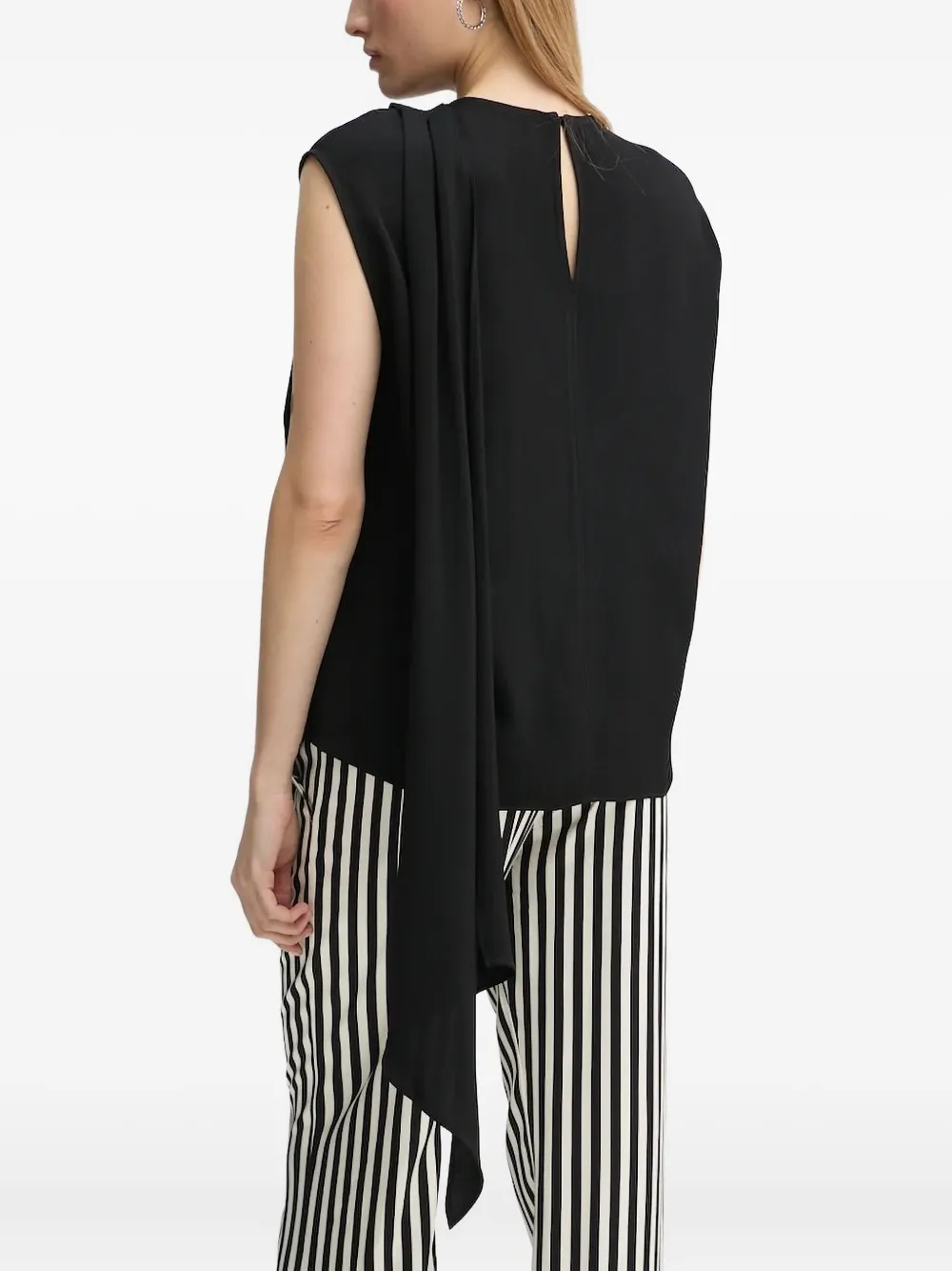 Черная безрукавка с драпированными плечами, круглым вырезом сзади и вырезом-замочной скважиной.