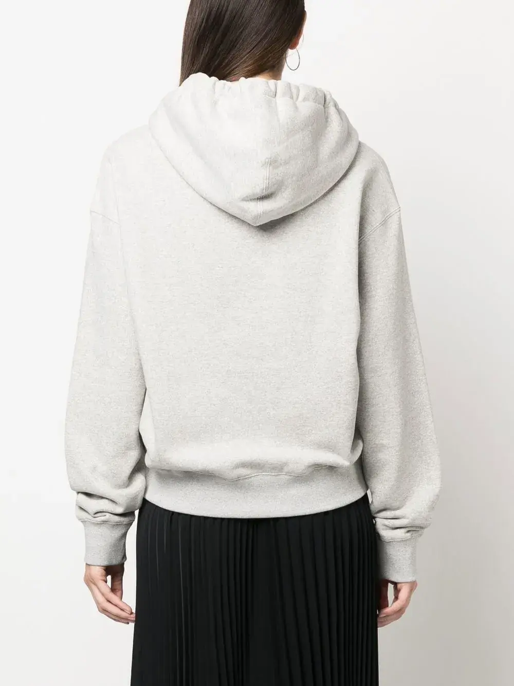 Светло-серый, хлопок, эффект меланж, принт с логотипом на груди, затягивающийся на шнурок капюшон, приспущенные плечи и длинные рукава.