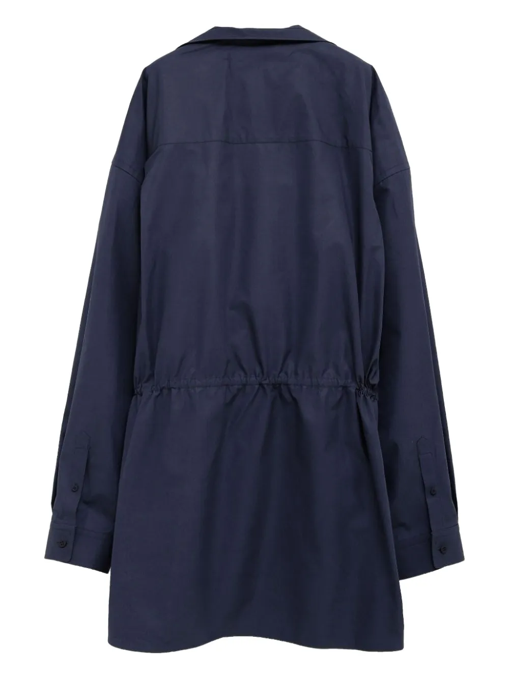 Воротник темно-синего цвета, застежка на пуговицы, кулиска на талии, длинные рукава, эффект запаха