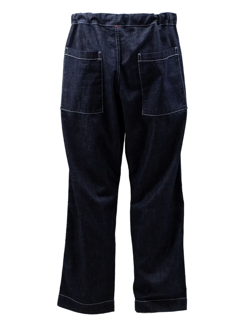 Синяя завязка на шнурке, боковые карманы, задние карманы, белая отделочная строчка.