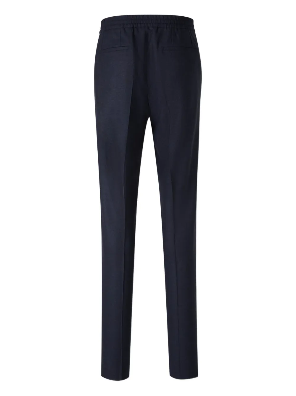 Темно-синяя фактурная ткань, накладные карманы спереди, затягивающиеся на шнурок, манжеты на пуговицах, застежка на одну пуговицу