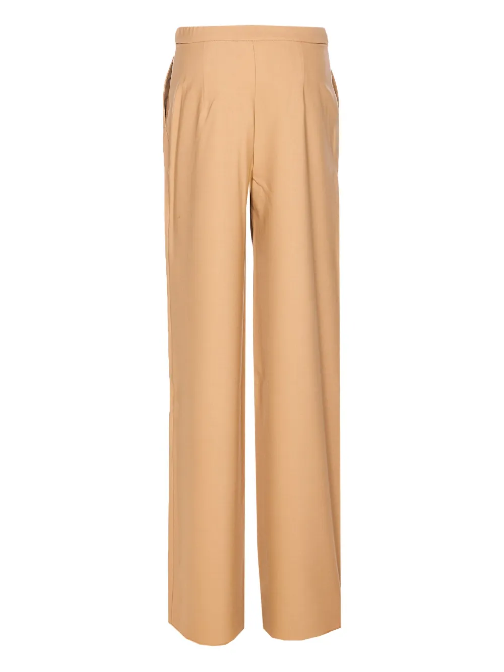 Бежевый, с завязками на талии, боковыми карманами, расклешенными штанинами, тканым материалом.