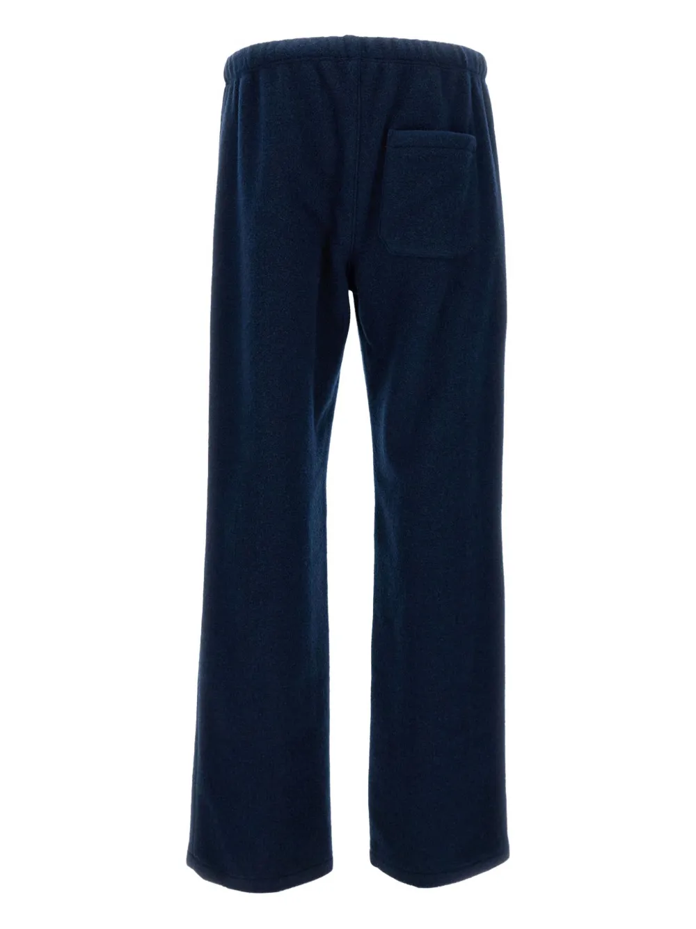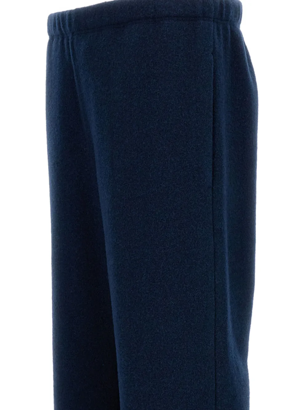 Темно-синяя шерстяная модель, затягивающийся шнурок на талии, прямой штанин, сзади прорезной карман, плоский перед